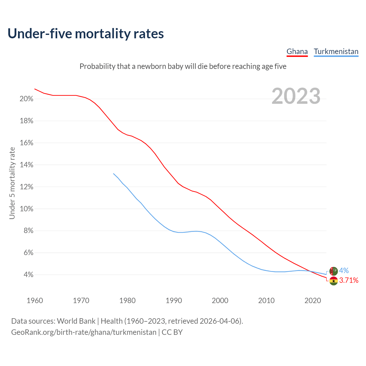 The chance that a newborn baby will die before reaching age five is 3.71% in Ghana and 4% in Turkmenistan. Above is a chart with historical data on under-five mortality rates.