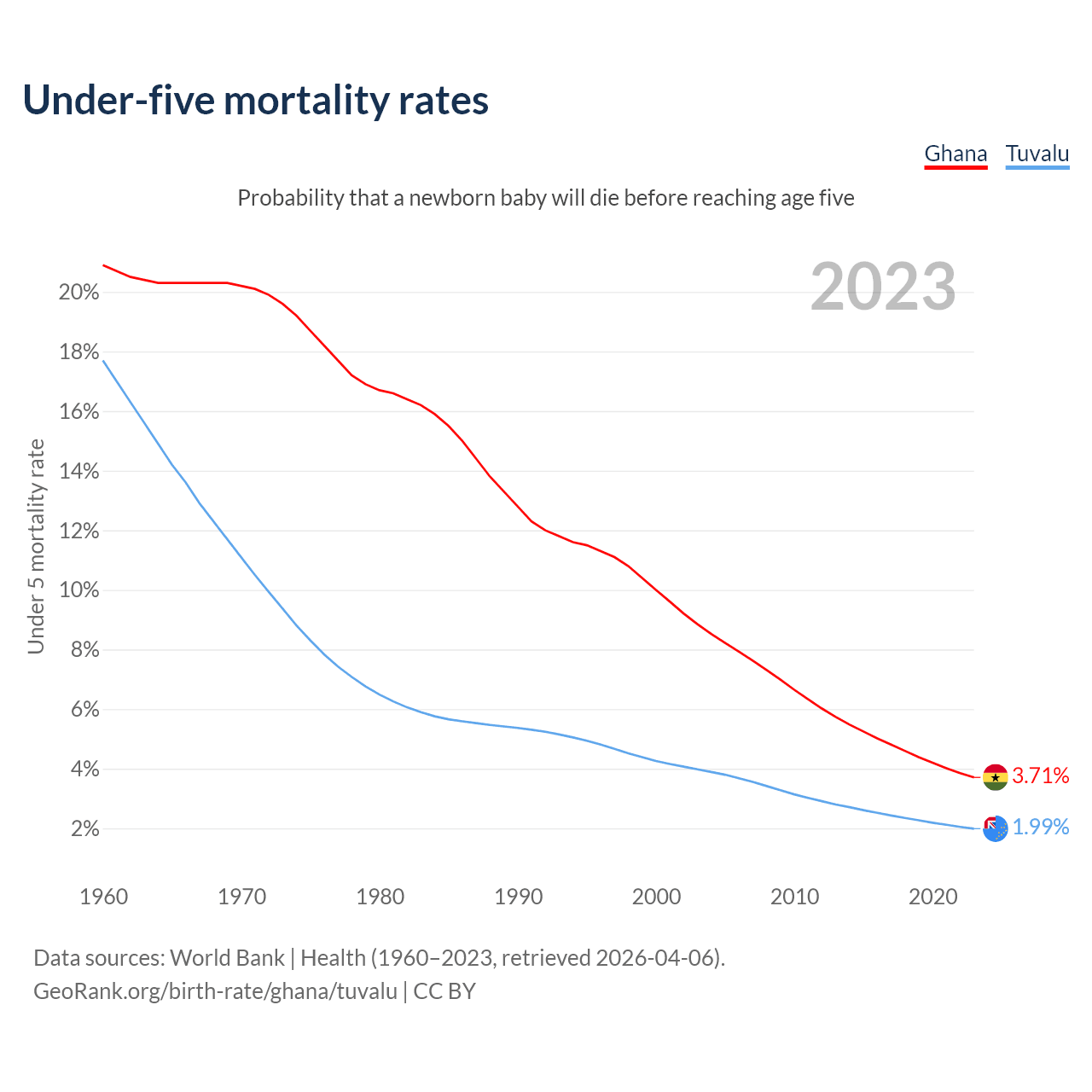 The chance that a newborn baby will die before reaching age five is 3.71% in Ghana and 1.99% in Tuvalu. Above is a chart with historical data on under-five mortality rates.