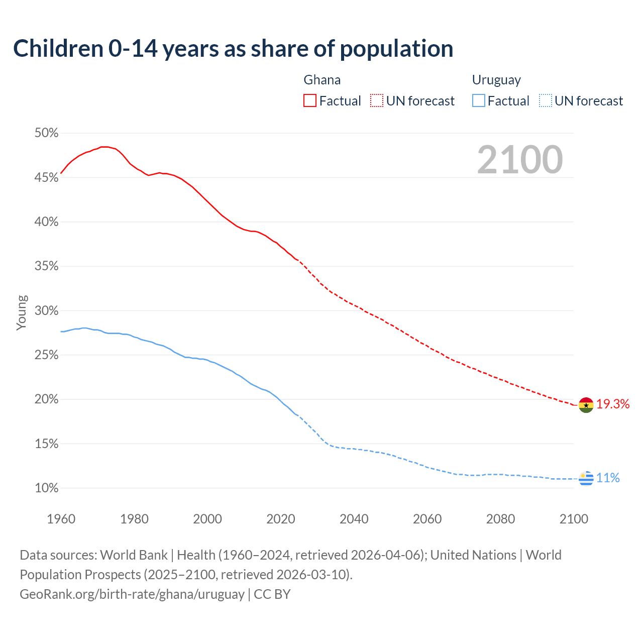 According to the latest available data on birth rates, the fertility rate in Ghana was 3.4 children per woman in 2023, compared to 1.41 in Uruguay in 2023. The replacement level is considered to be 2.1 children per woman.