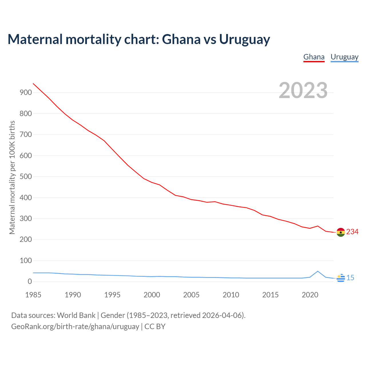 The maternal mortality rate, which is the probability of dying during childbirth or within 42 days of pregnancy termination, is 234 deaths per 100,000 live births in Ghana, compared to 15 deaths in Uruguay.