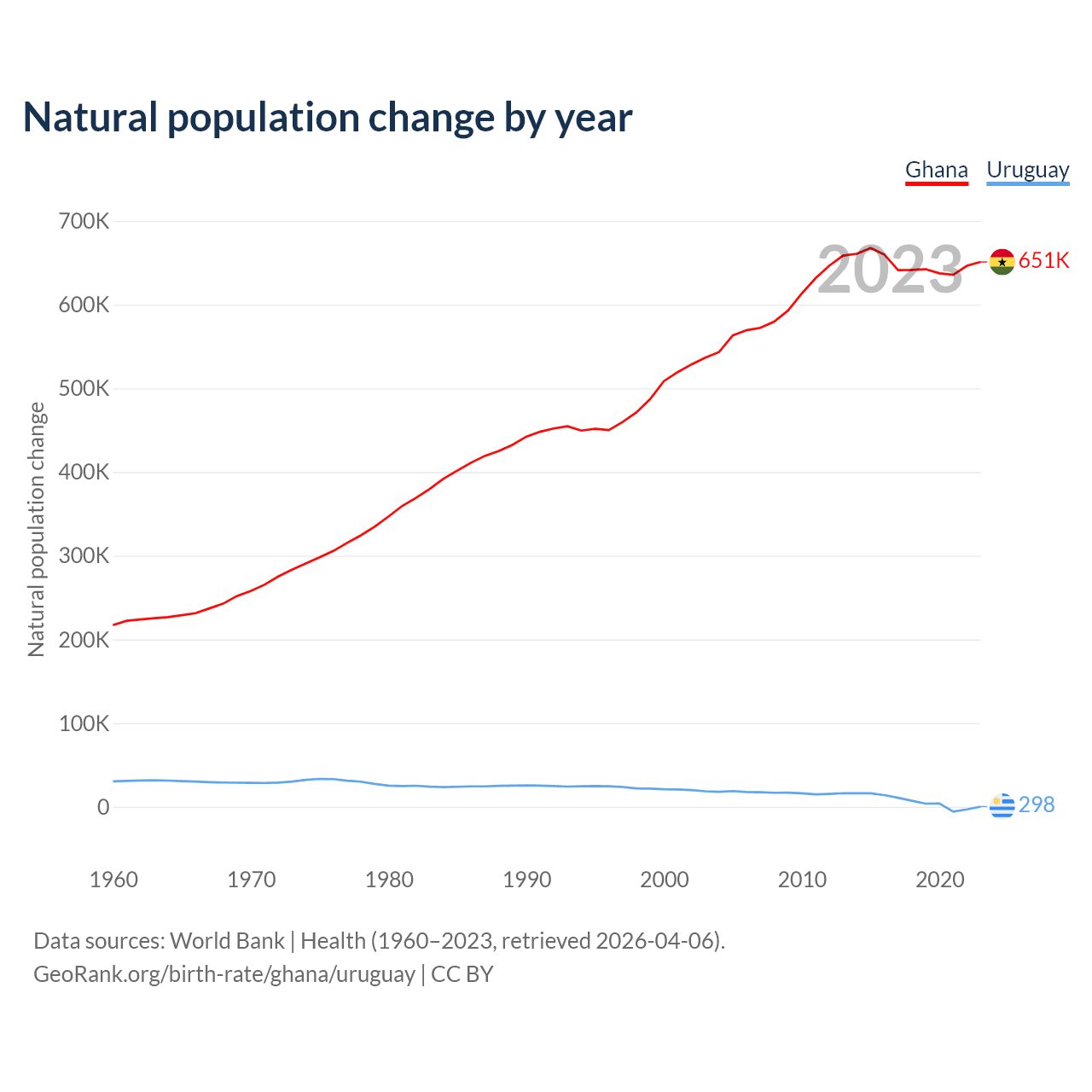 Ghana has an annual birth rate of 26.3 births per 1,000 people, compared to 9.87 for Uruguay. The average number of children a woman is expected to have during her lifetime — the fertility rate, is 3.4 in Ghana and 1.41 in Uruguay — 58.5% difference.