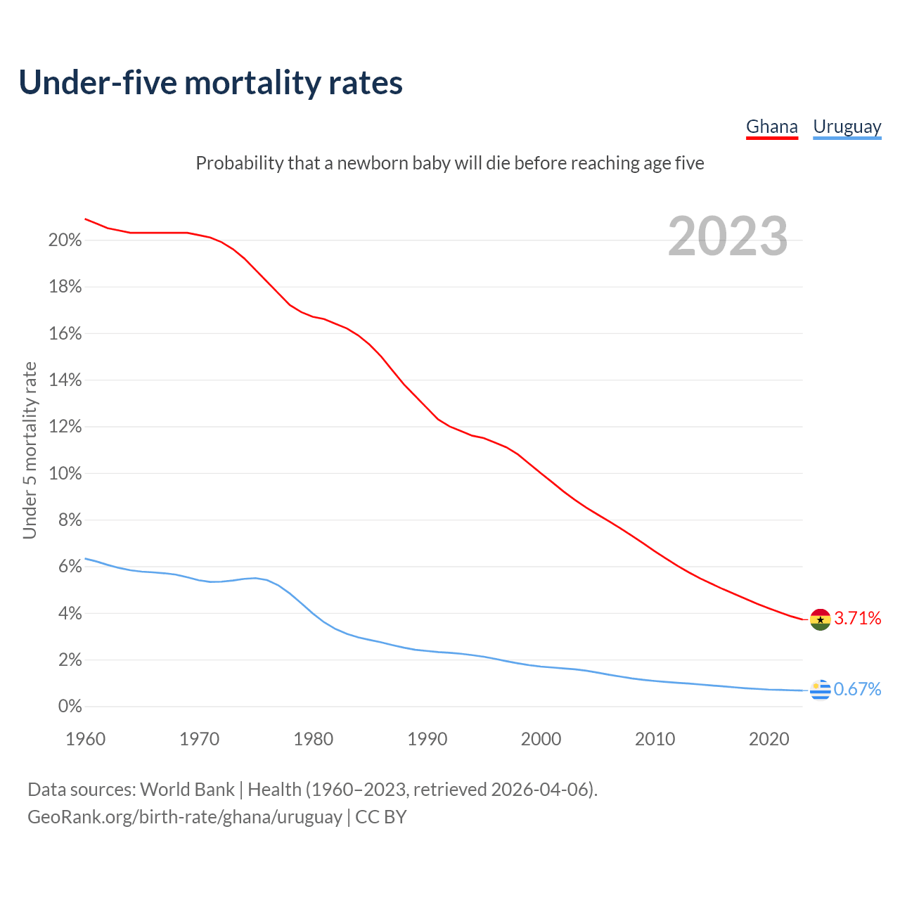 The chance that a newborn baby will die before reaching age five is 3.71% in Ghana and 0.67% in Uruguay. Above is a chart with historical data on under-five mortality rates.