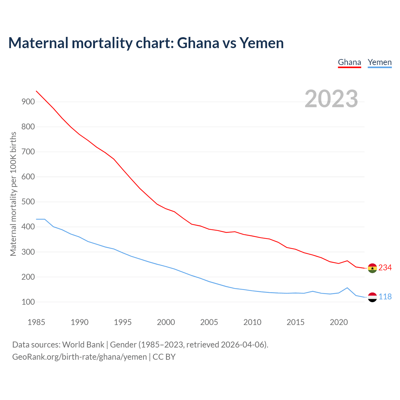 The maternal mortality rate, which is the probability of dying during childbirth or within 42 days of pregnancy termination, is 234 deaths per 100,000 live births in Ghana, compared to 118 deaths in Yemen.