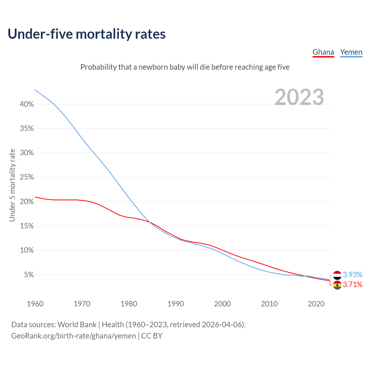 The chance that a newborn baby will die before reaching age five is 3.71% in Ghana and 3.93% in Yemen. Above is a chart with historical data on under-five mortality rates.