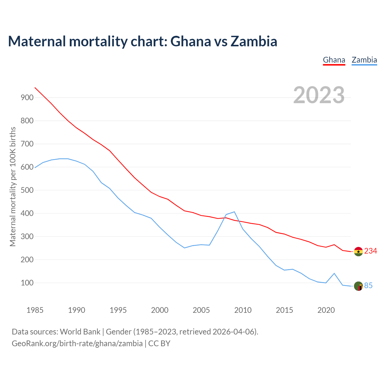 The maternal mortality rate, which is the probability of dying during childbirth or within 42 days of pregnancy termination, is 234 deaths per 100,000 live births in Ghana, compared to 85 deaths in Zambia.