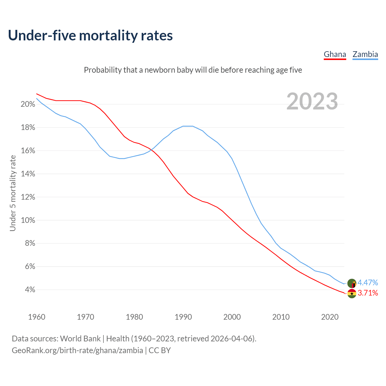 The chance that a newborn baby will die before reaching age five is 3.71% in Ghana and 4.47% in Zambia. Above is a chart with historical data on under-five mortality rates.