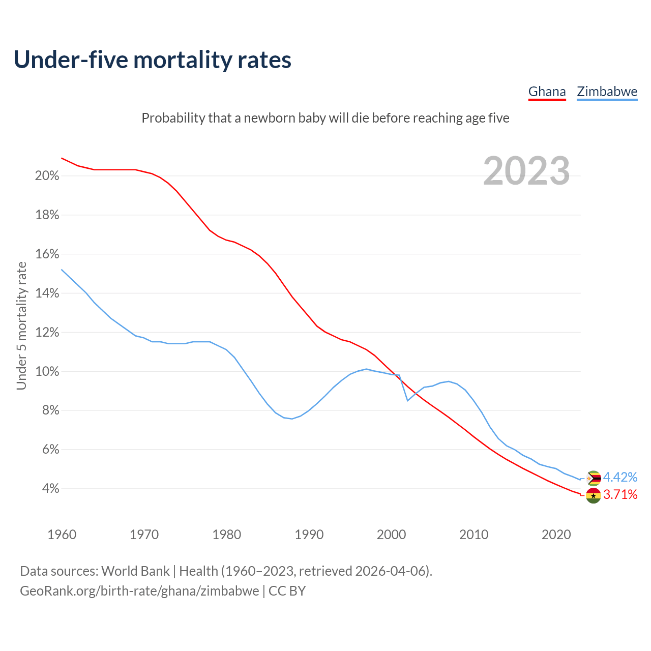 The chance that a newborn baby will die before reaching age five is 3.71% in Ghana and 4.42% in Zimbabwe. Above is a chart with historical data on under-five mortality rates.