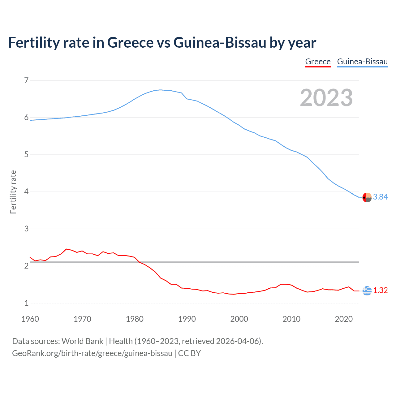 1960 vs 2023, the fertility rate has decreased by 40.8% in Greece and by 35.2% in Guinea-Bissau — in 1960, it was 2.23 and 5.92, respectively.