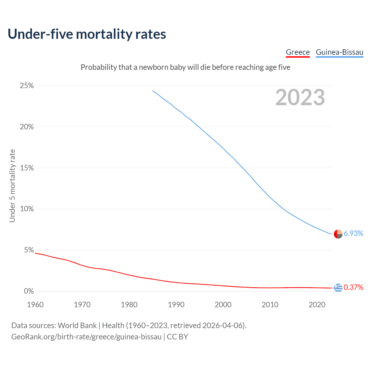 The chance that a newborn baby will die before reaching age five is 0.37% in Greece and 6.93% in Guinea-Bissau. Above is a chart with historical data on under-five mortality rates.