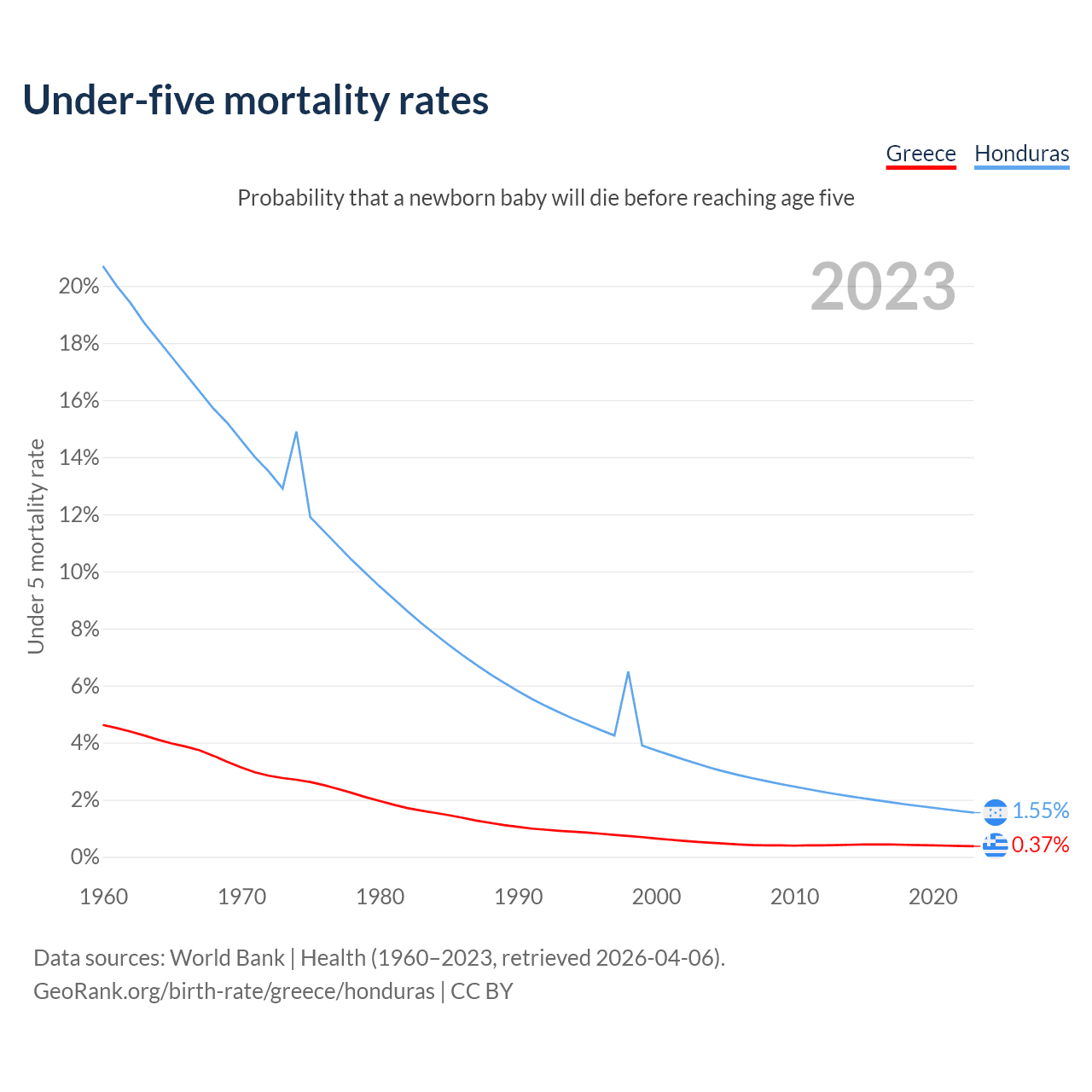 The chance that a newborn baby will die before reaching age five is 0.37% in Greece and 1.55% in Honduras. Above is a chart with historical data on under-five mortality rates.