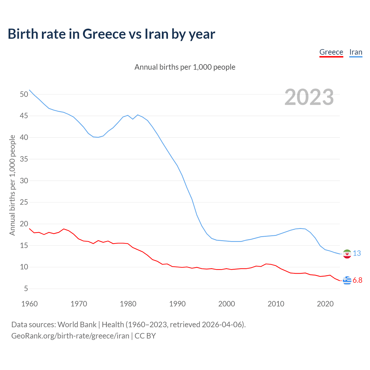 According to the latest available data on birth rates, the fertility rate in Greece was 1.32 children per woman in 2023, compared to 1.7 in Iran in 2023. The replacement level is considered to be 2.1 children per woman.