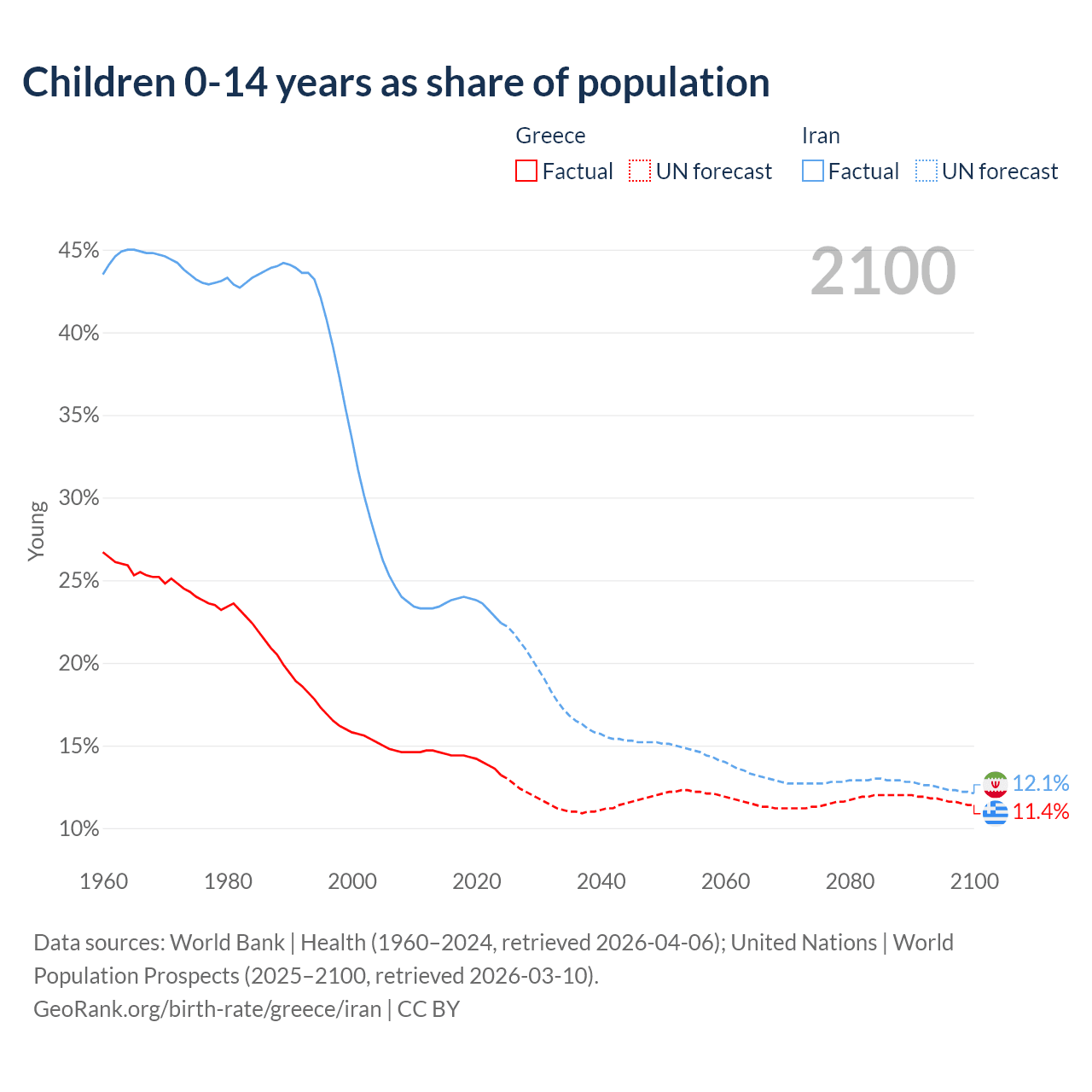 Greece has an annual birth rate of 6.8 births per 1,000 people, compared to 13 for Iran. The average number of children a woman is expected to have during her lifetime — the fertility rate, is 1.32 in Greece and 1.7 in Iran — 28.4% difference.
