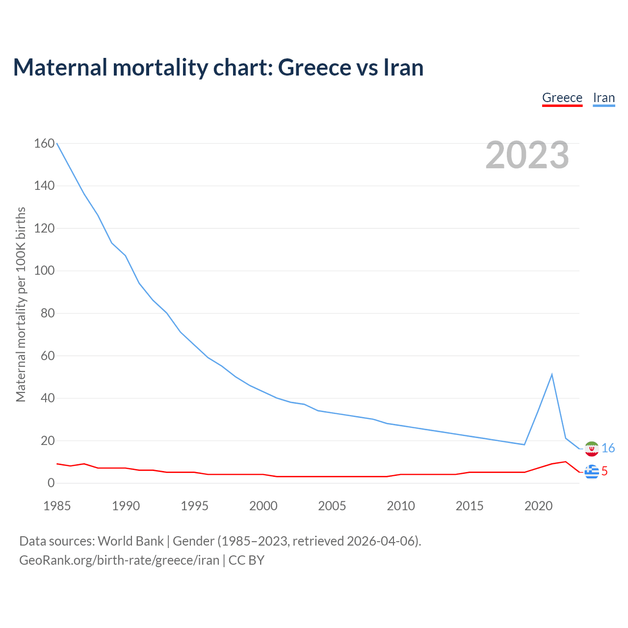 The maternal mortality rate, which is the probability of dying during childbirth or within 42 days of pregnancy termination, is 5 deaths per 100,000 live births in Greece, compared to 16 deaths in Iran.