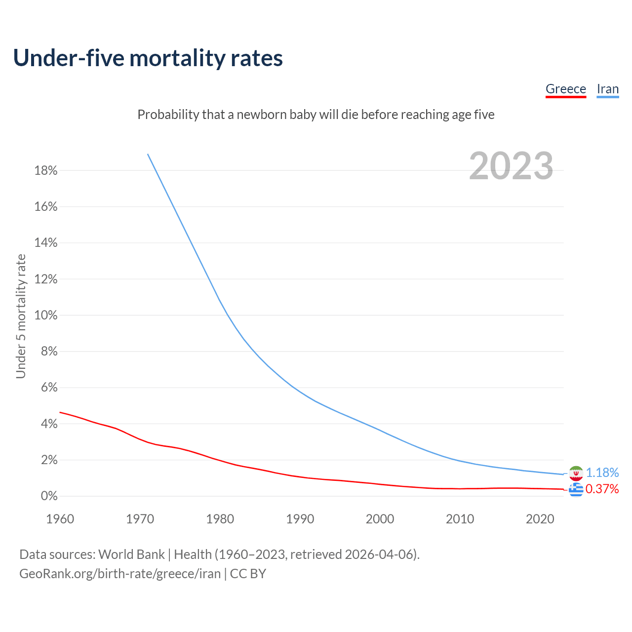 The chance that a newborn baby will die before reaching age five is 0.37% in Greece and 1.18% in Iran. Above is a chart with historical data on under-five mortality rates.