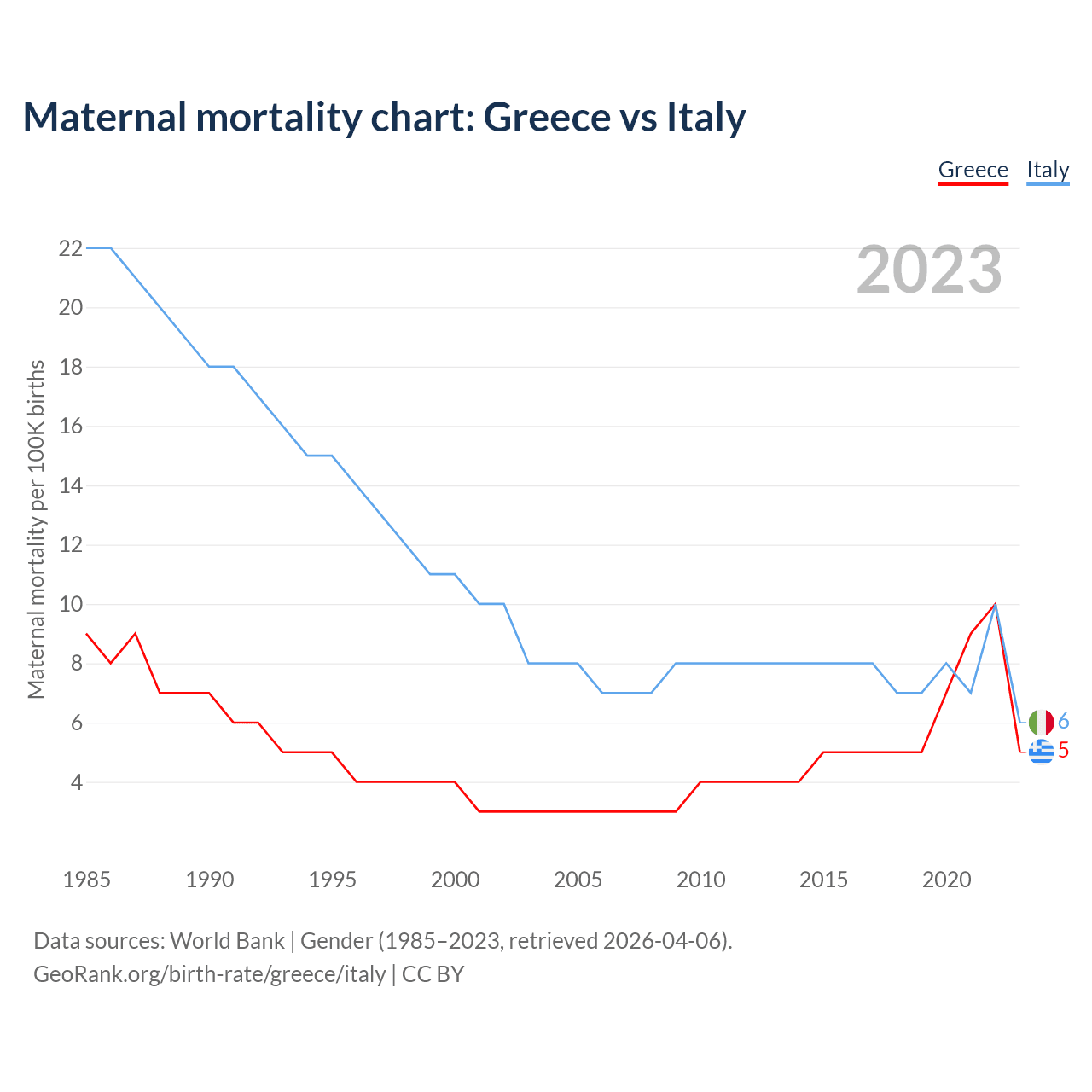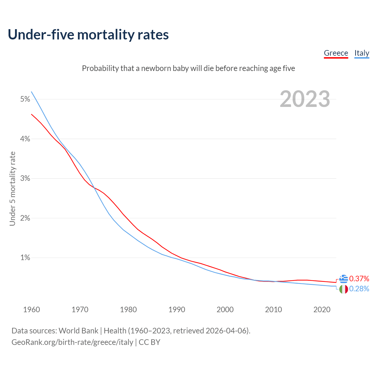 The chance that a newborn baby will die before reaching age five is 0.37% in Greece and 0.28% in Italy. Above is a chart with historical data on under-five mortality rates.