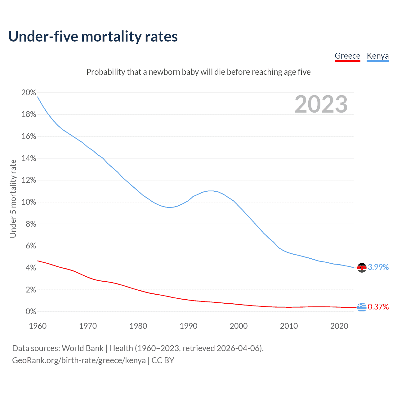 The chance that a newborn baby will die before reaching age five is 0.37% in Greece and 3.99% in Kenya. Above is a chart with historical data on under-five mortality rates.