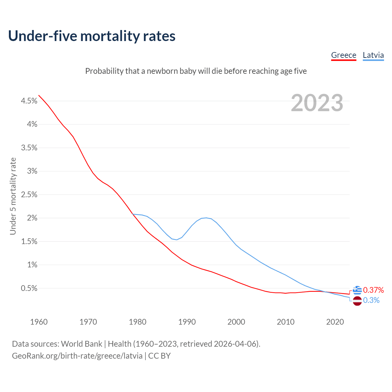 The chance that a newborn baby will die before reaching age five is 0.37% in Greece and 0.3% in Latvia. Above is a chart with historical data on under-five mortality rates.