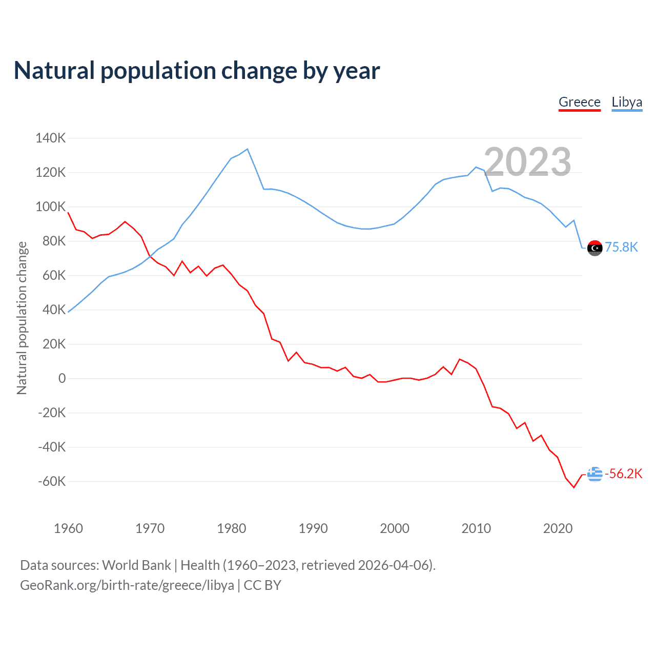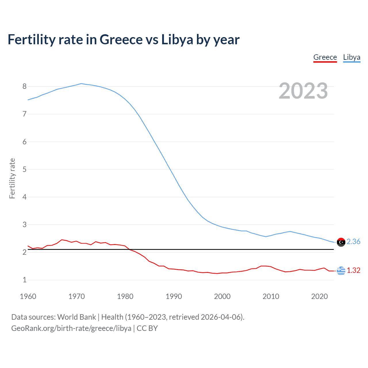 According to the latest available data on birth rates, the fertility rate in Greece was 1.32 children per woman in 2023, compared to 2.36 in Libya in 2023. The replacement level is considered to be 2.1 children per woman.