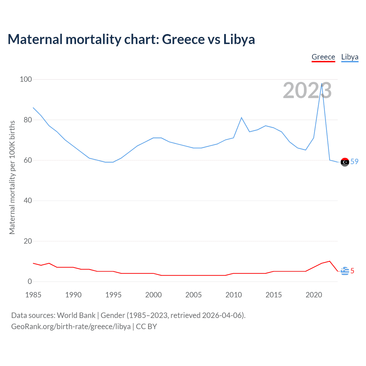 The maternal mortality rate, which is the probability of dying during childbirth or within 42 days of pregnancy termination, is 5 deaths per 100,000 live births in Greece, compared to 59 deaths in Libya.