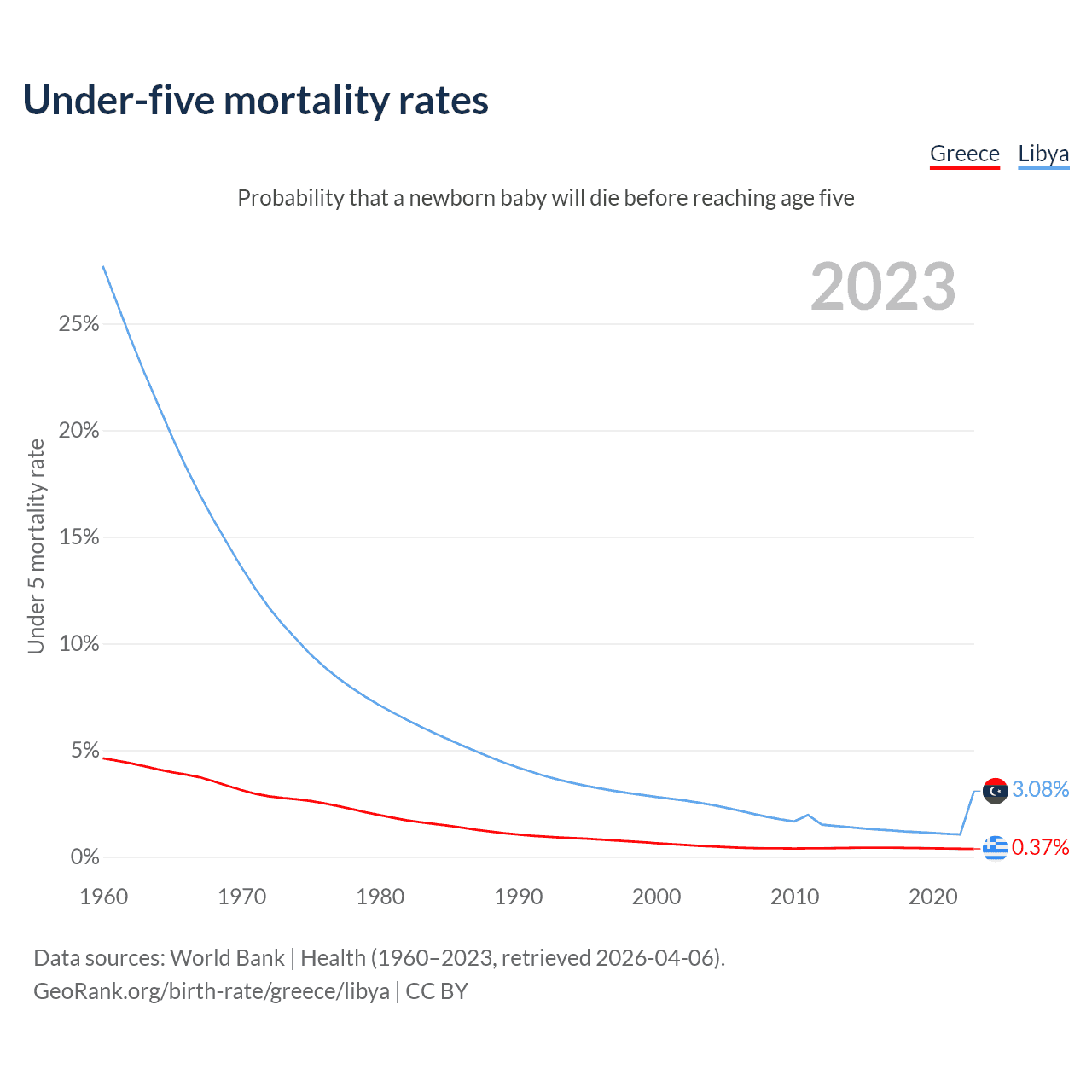 The chance that a newborn baby will die before reaching age five is 0.37% in Greece and 3.08% in Libya. Above is a chart with historical data on under-five mortality rates.