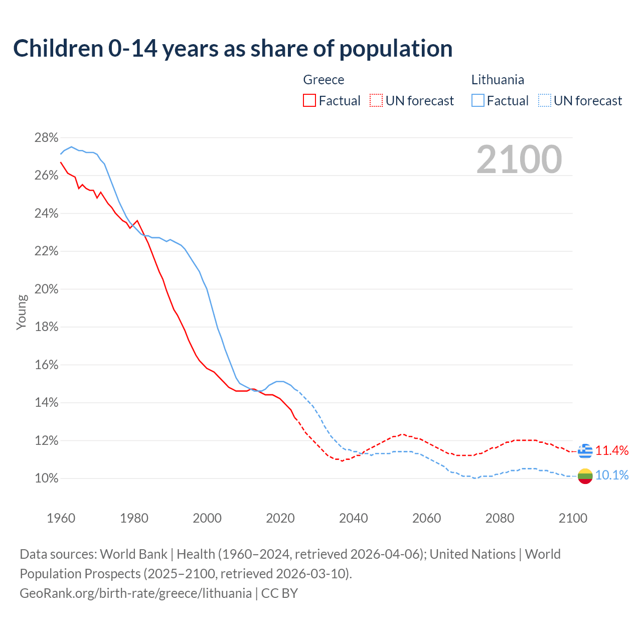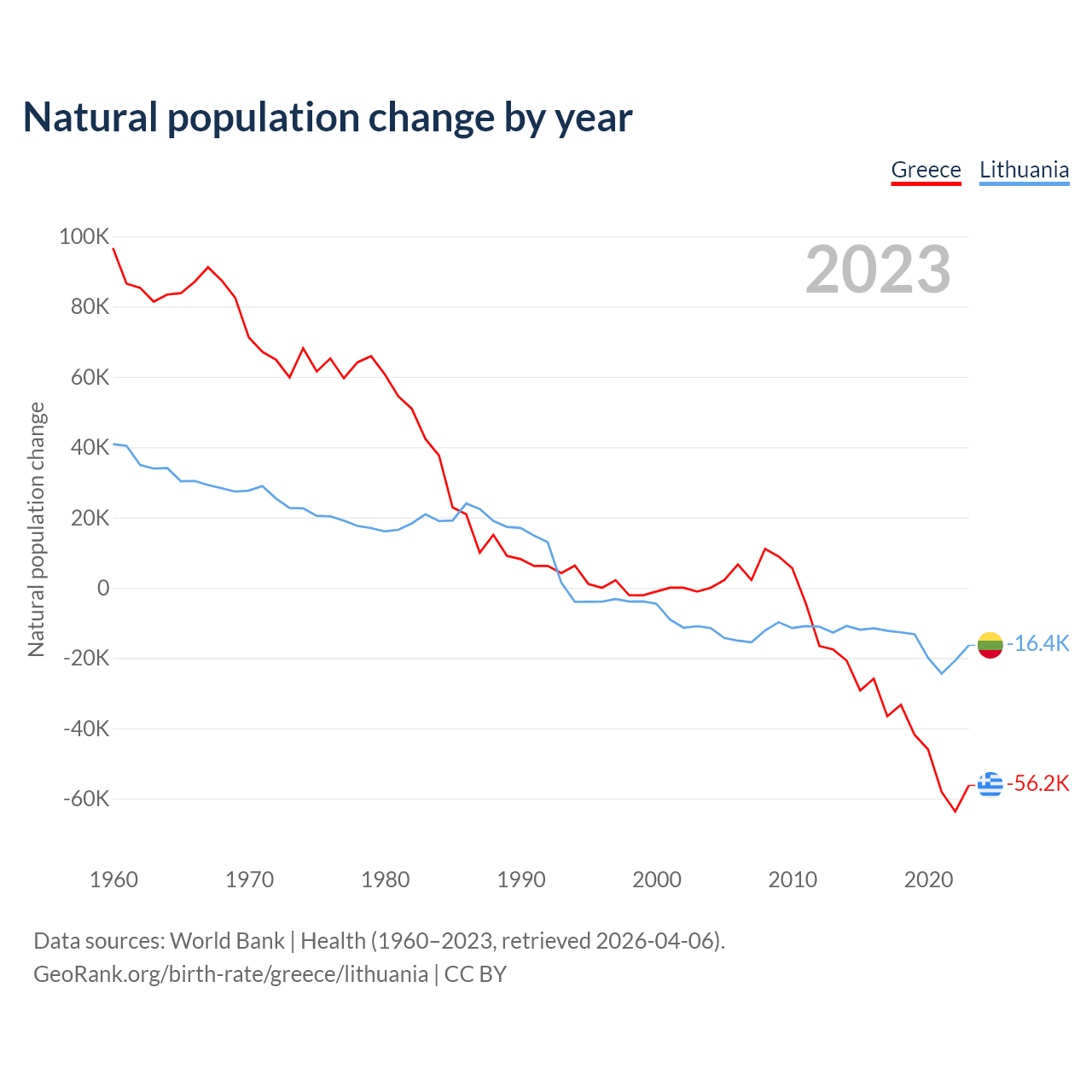 According to the latest available data on birth rates, the fertility rate in Greece was 1.32 children per woman in 2023, compared to 1.18 in Lithuania in 2023. The replacement level is considered to be 2.1 children per woman.