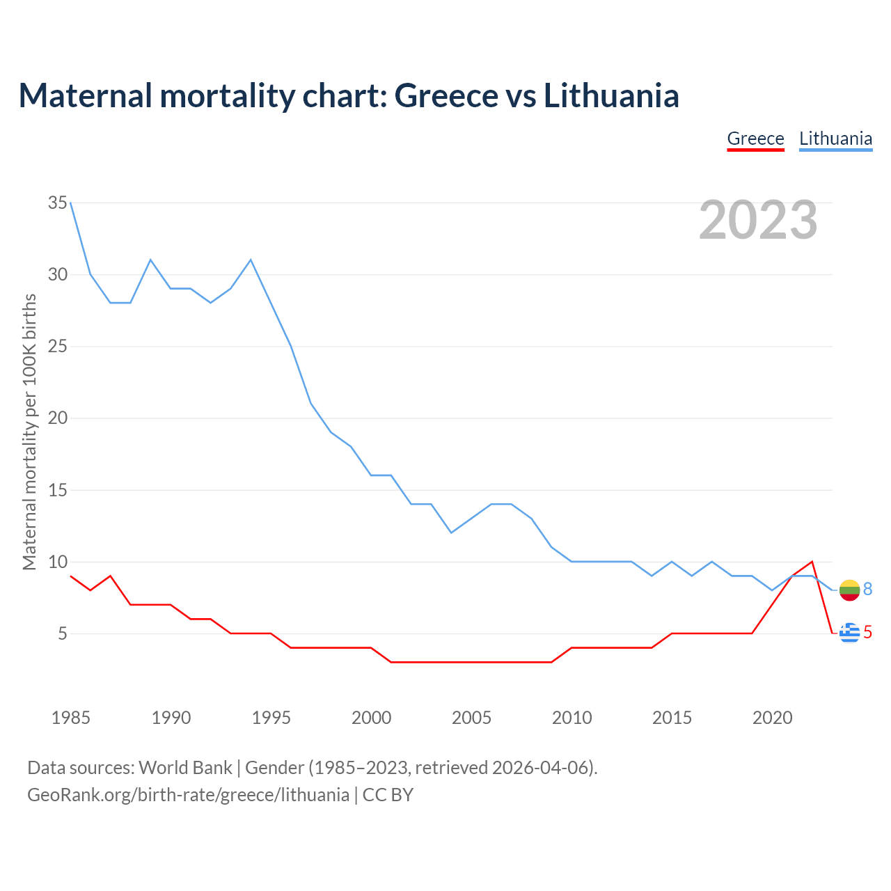 The maternal mortality rate, which is the probability of dying during childbirth or within 42 days of pregnancy termination, is 5 deaths per 100,000 live births in Greece, compared to 8 deaths in Lithuania.