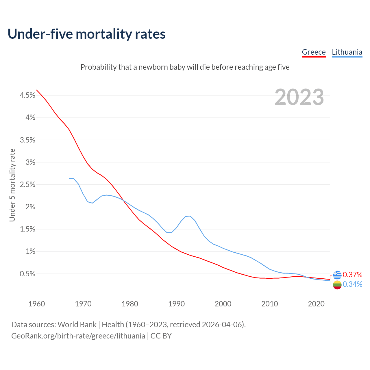 The chance that a newborn baby will die before reaching age five is 0.37% in Greece and 0.34% in Lithuania. Above is a chart with historical data on under-five mortality rates.
