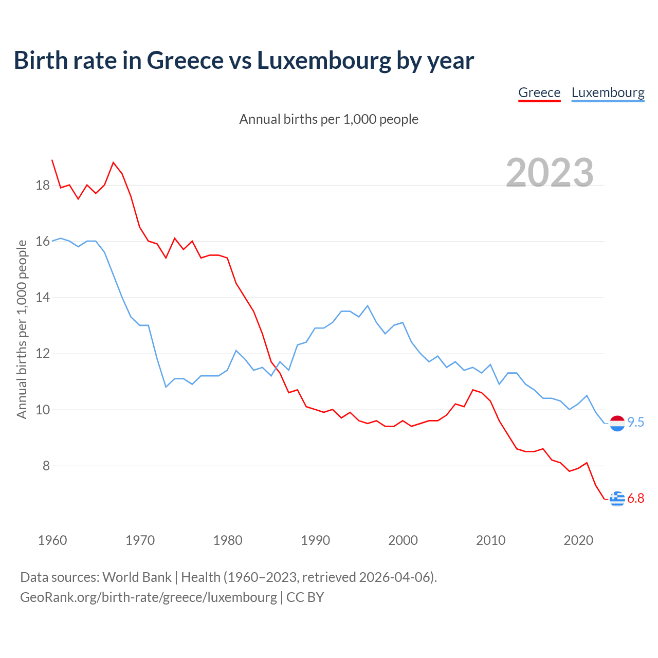 Greece has an annual birth rate of 6.8 births per 1,000 people, compared to 9.5 for Luxembourg. The average number of children a woman is expected to have during her lifetime — the fertility rate, is 1.32 in Greece and 1.25 in Luxembourg — 5.3% difference.