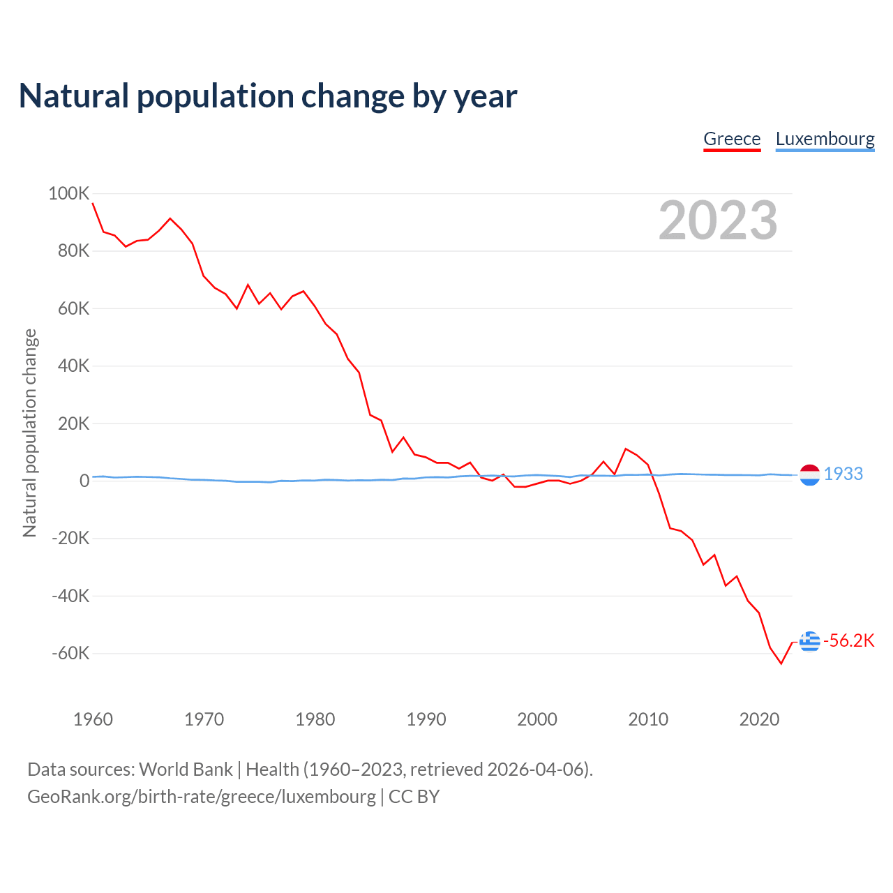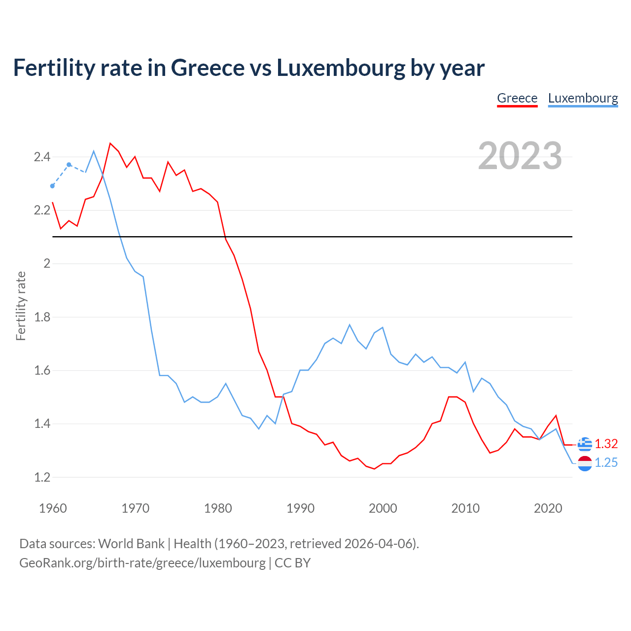 According to the latest available data on birth rates, the fertility rate in Greece was 1.32 children per woman in 2023, compared to 1.25 in Luxembourg in 2023. The replacement level is considered to be 2.1 children per woman.