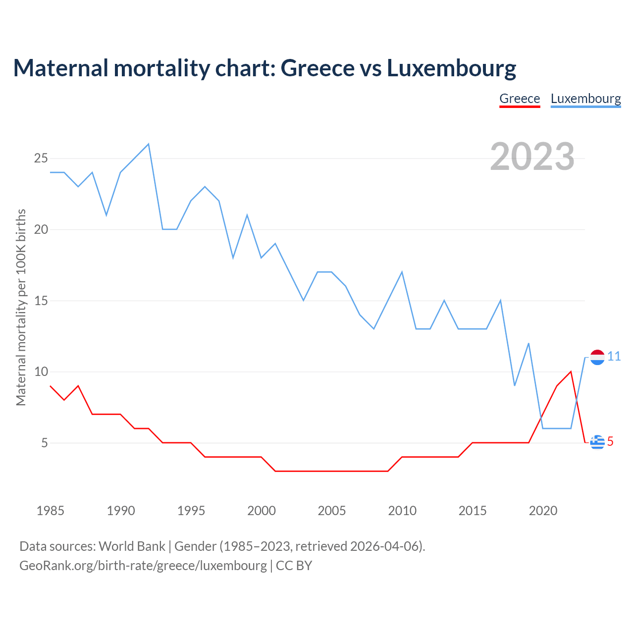 The maternal mortality rate, which is the probability of dying during childbirth or within 42 days of pregnancy termination, is 5 deaths per 100,000 live births in Greece, compared to 11 deaths in Luxembourg.