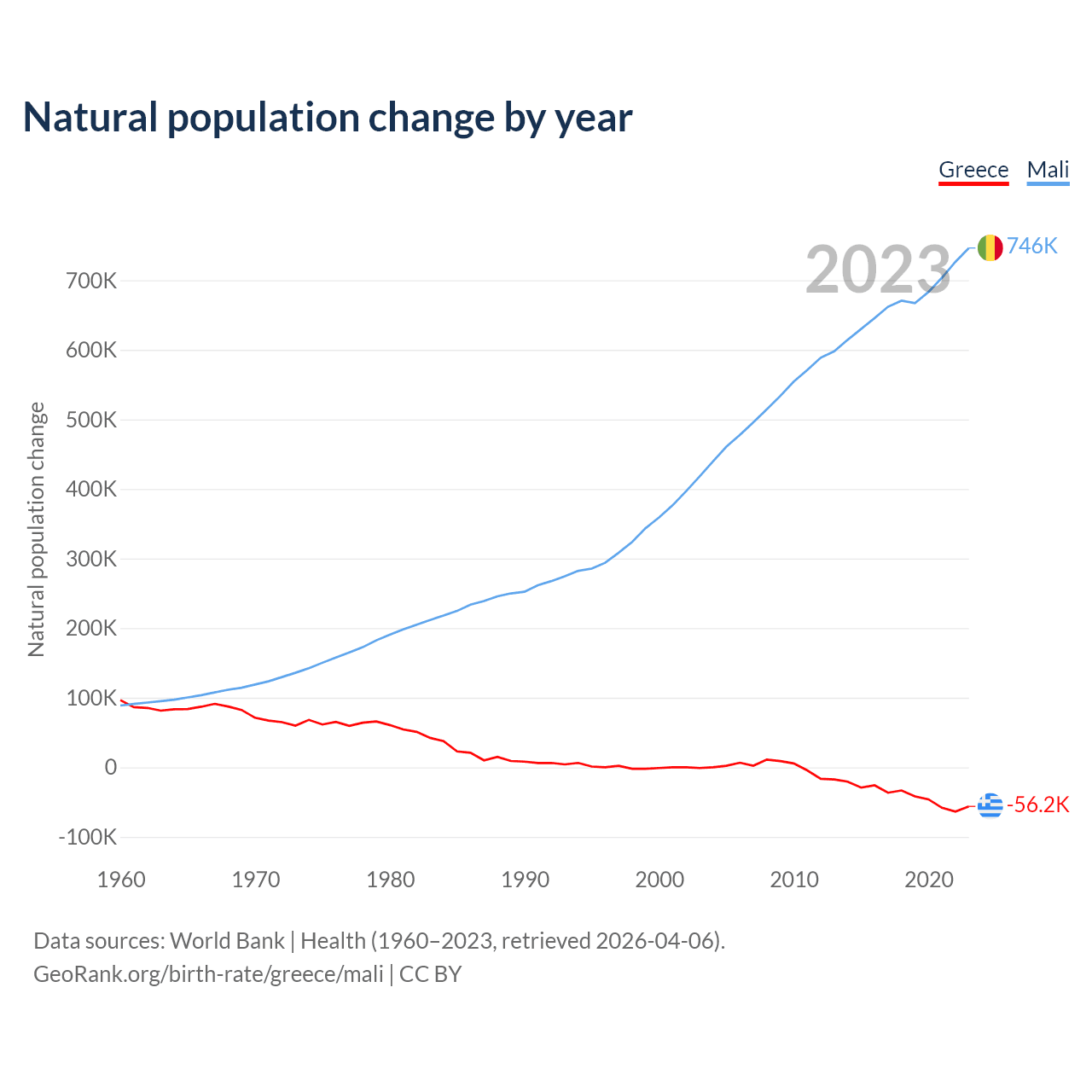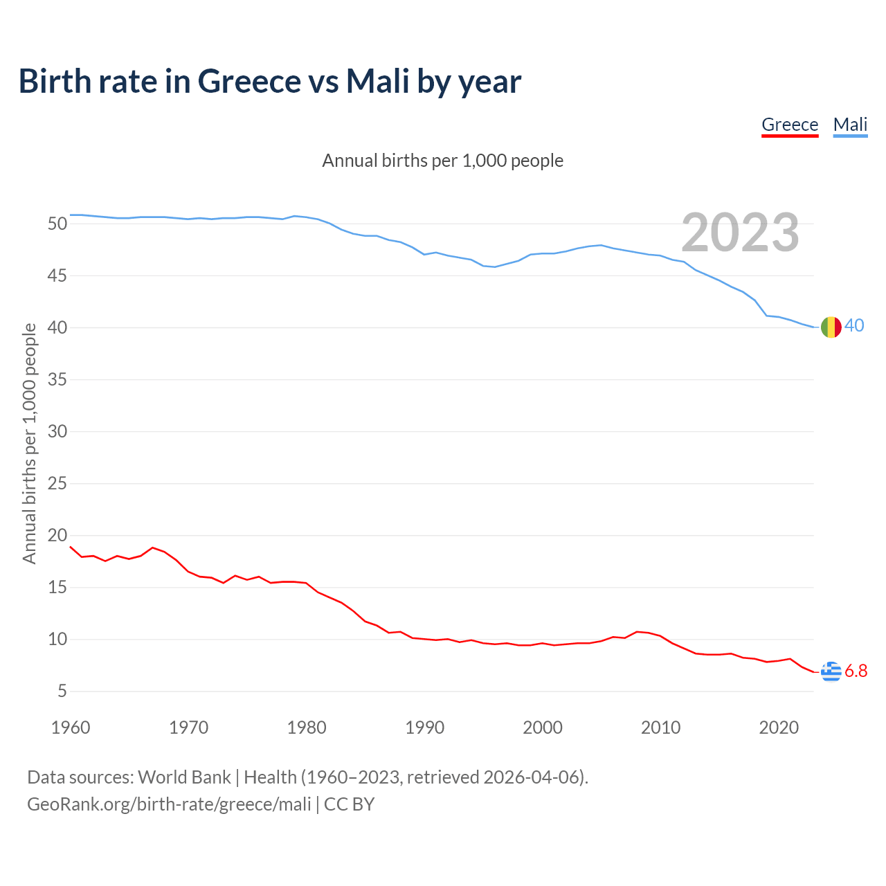 Greece has an annual birth rate of 6.8 births per 1,000 people, compared to 40 for Mali. The average number of children a woman is expected to have during her lifetime — the fertility rate, is 1.32 in Greece and 5.61 in Mali — 325% difference.