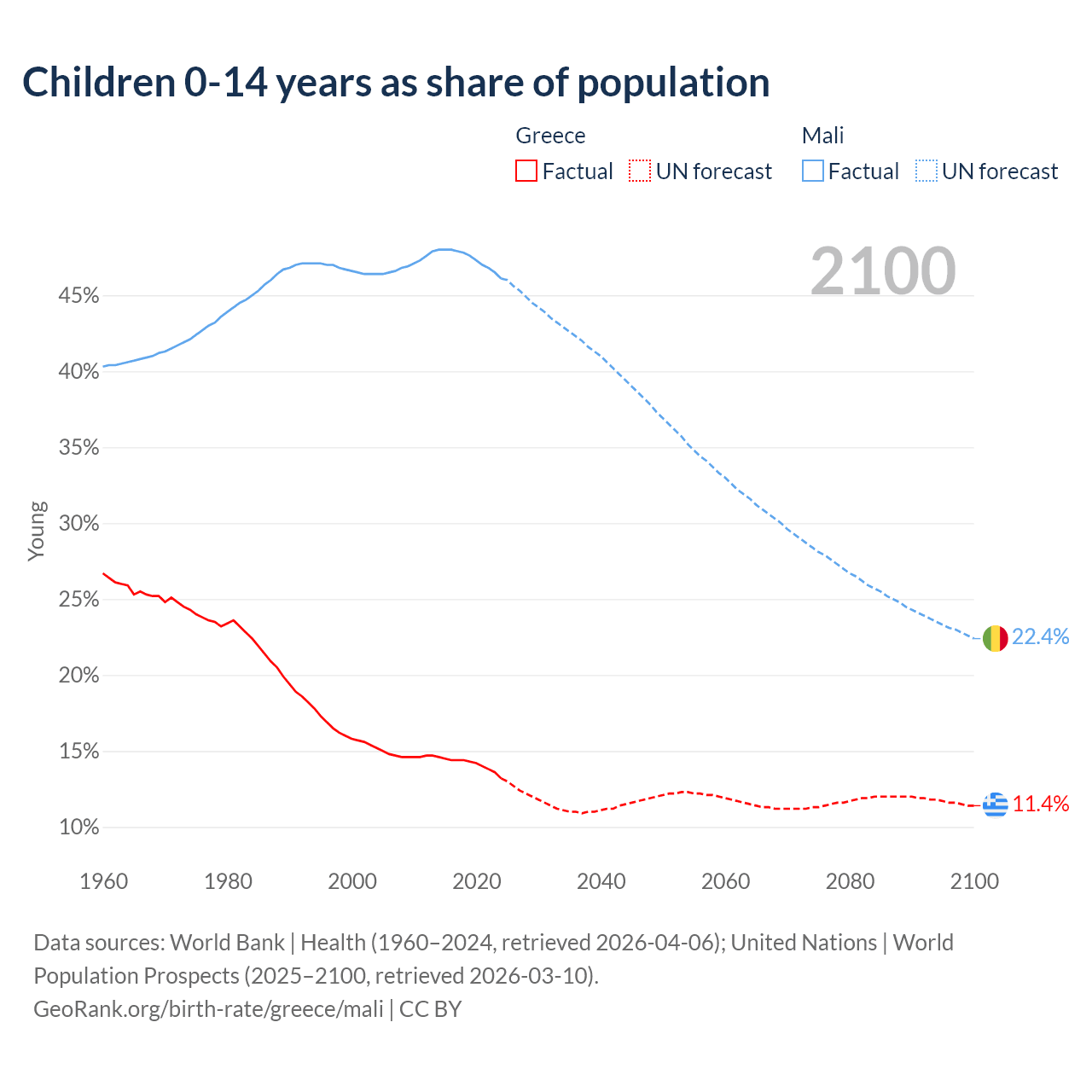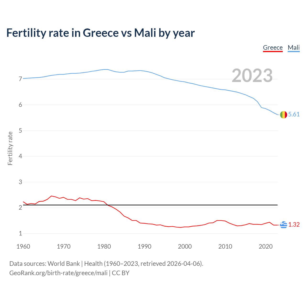 According to the latest available data on birth rates, the fertility rate in Greece was 1.32 children per woman in 2023, compared to 5.61 in Mali in 2023. The replacement level is considered to be 2.1 children per woman.