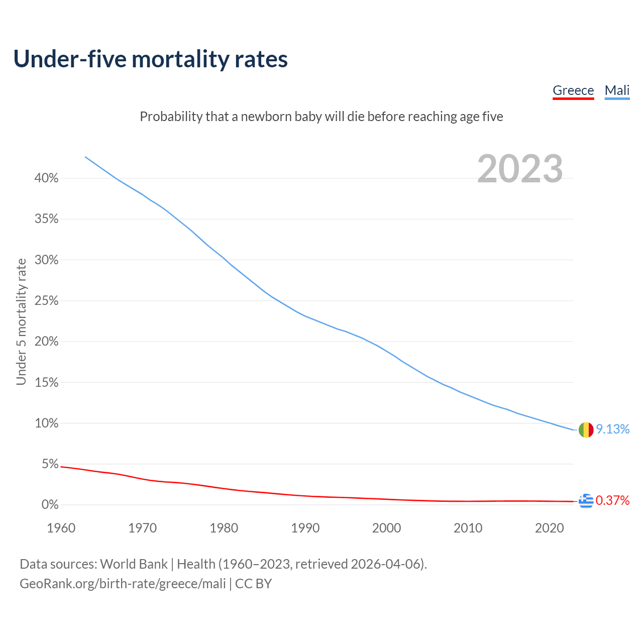 The chance that a newborn baby will die before reaching age five is 0.37% in Greece and 9.13% in Mali. Above is a chart with historical data on under-five mortality rates.