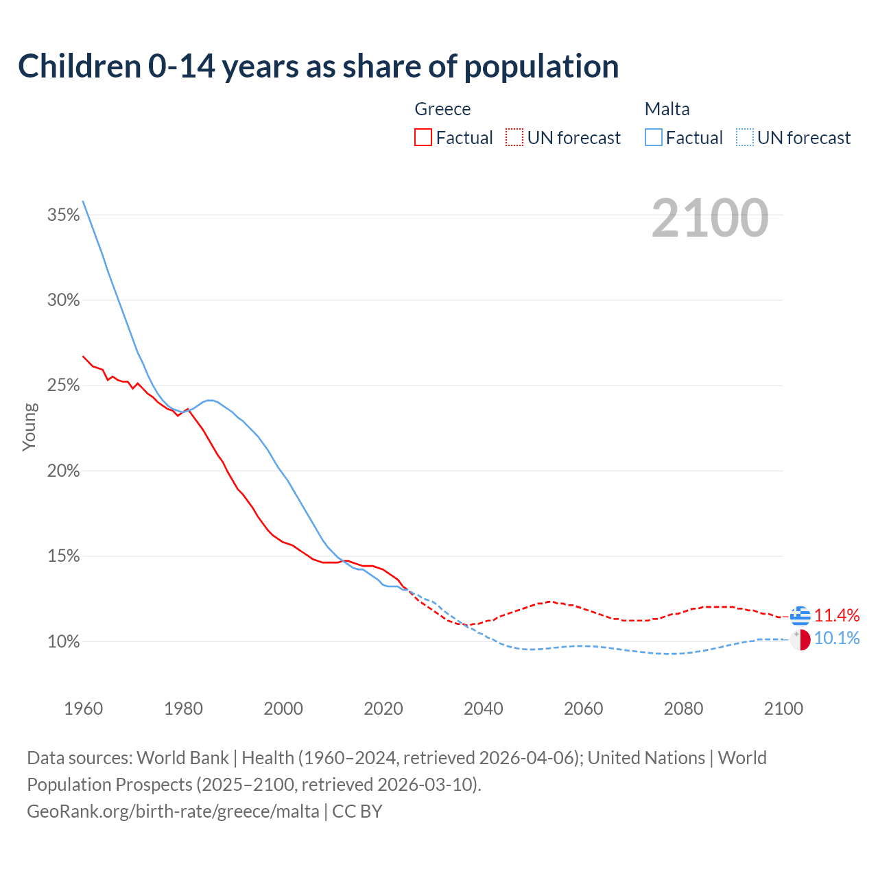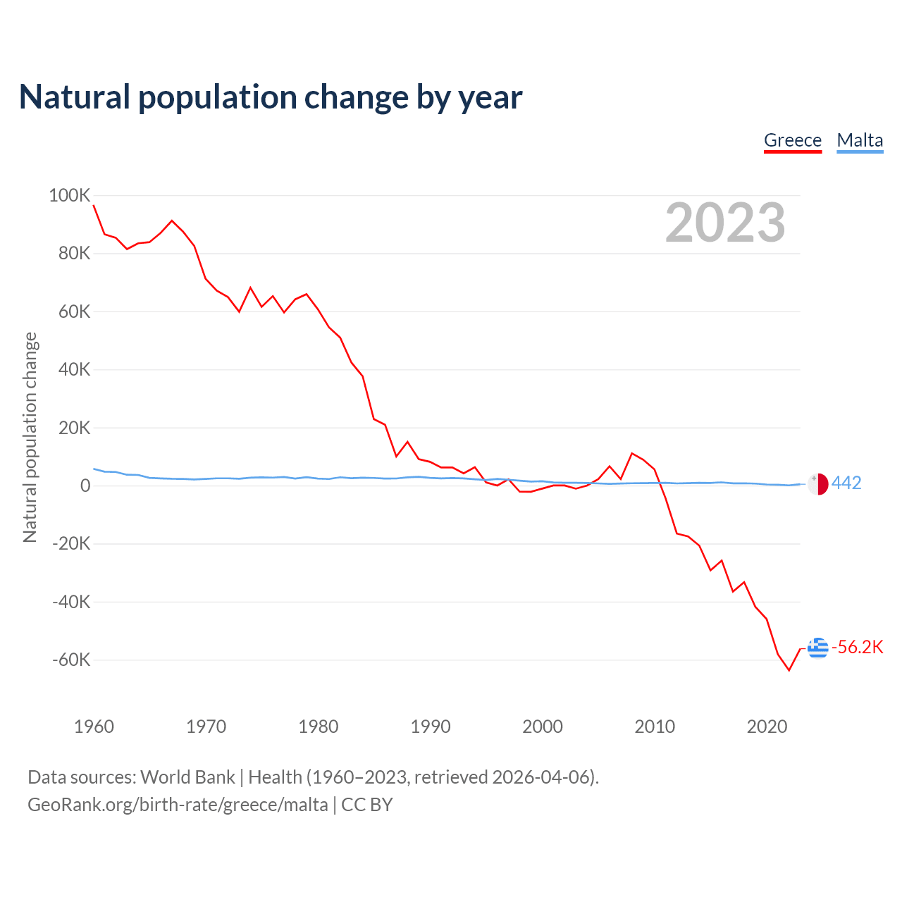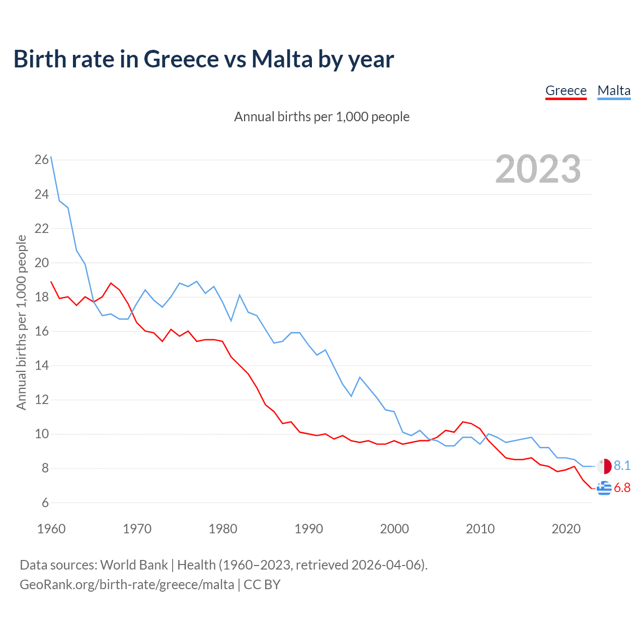 According to the latest available data on birth rates, the fertility rate in Greece was 1.32 children per woman in 2023, compared to 1.06 in Malta in 2023. The replacement level is considered to be 2.1 children per woman.