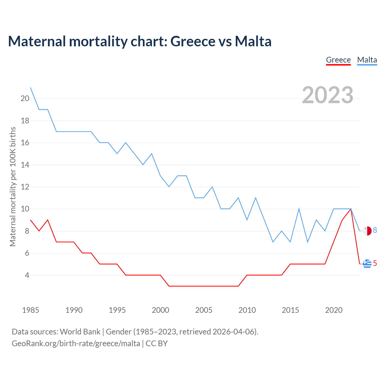 The maternal mortality rate, which is the probability of dying during childbirth or within 42 days of pregnancy termination, is 5 deaths per 100,000 live births in Greece, compared to 8 deaths in Malta.