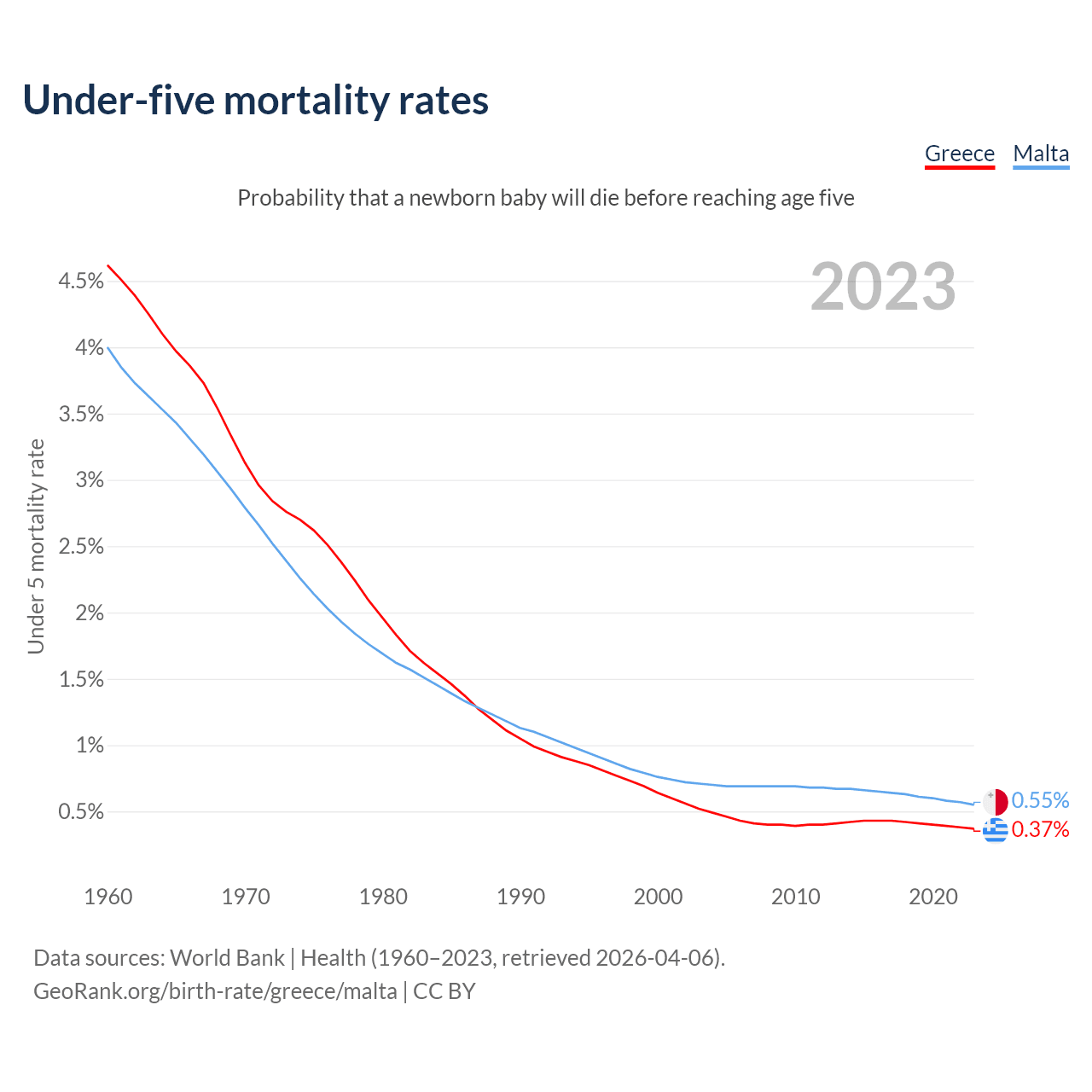 The chance that a newborn baby will die before reaching age five is 0.37% in Greece and 0.55% in Malta. Above is a chart with historical data on under-five mortality rates.