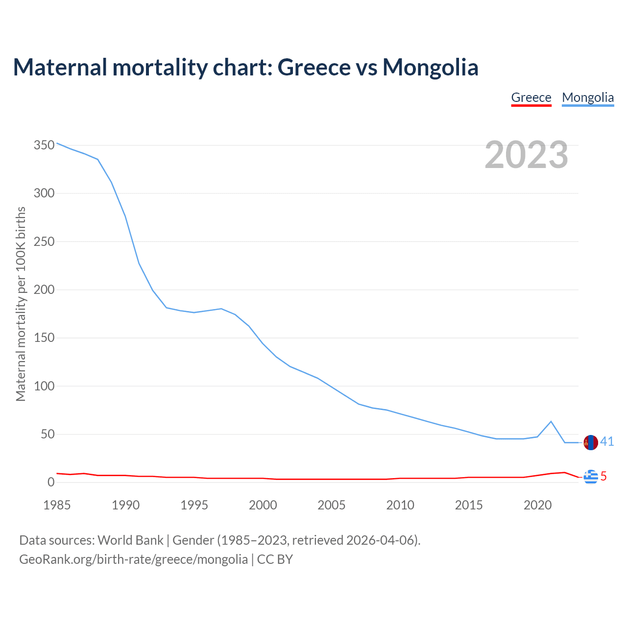 The maternal mortality rate, which is the probability of dying during childbirth or within 42 days of pregnancy termination, is 5 deaths per 100,000 live births in Greece, compared to 41 deaths in Mongolia.