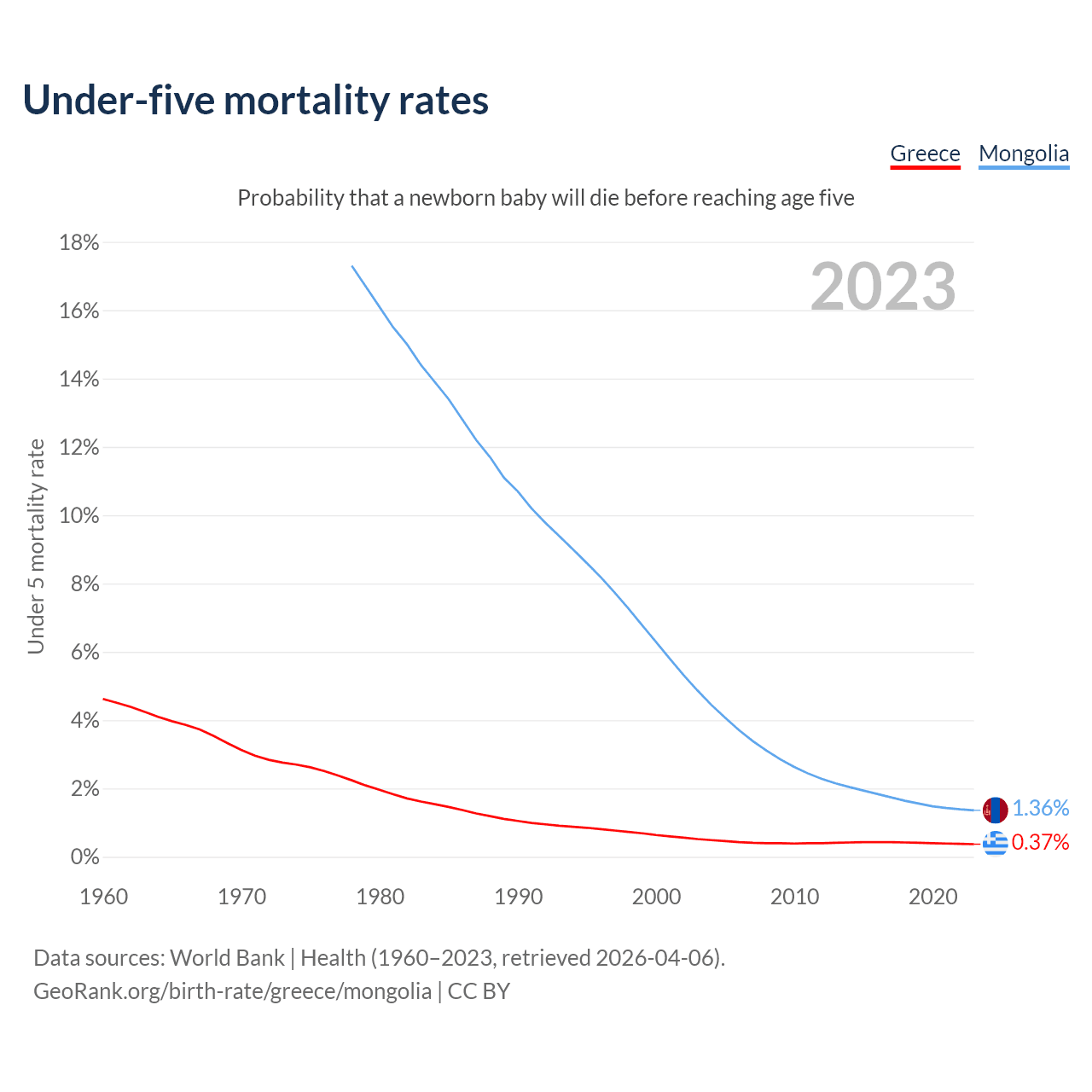 The chance that a newborn baby will die before reaching age five is 0.37% in Greece and 1.36% in Mongolia. Above is a chart with historical data on under-five mortality rates.