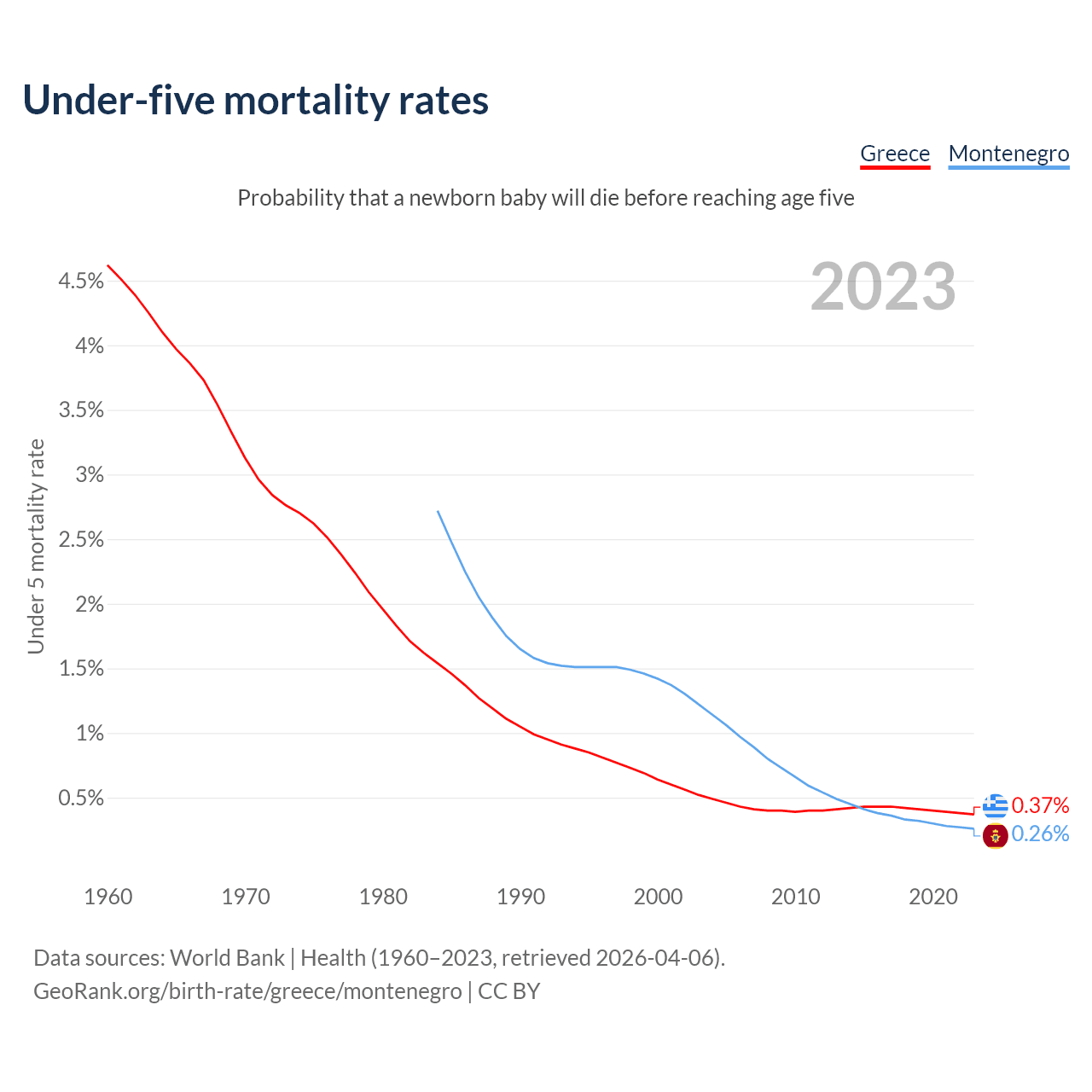 The chance that a newborn baby will die before reaching age five is 0.37% in Greece and 0.26% in Montenegro. Above is a chart with historical data on under-five mortality rates.