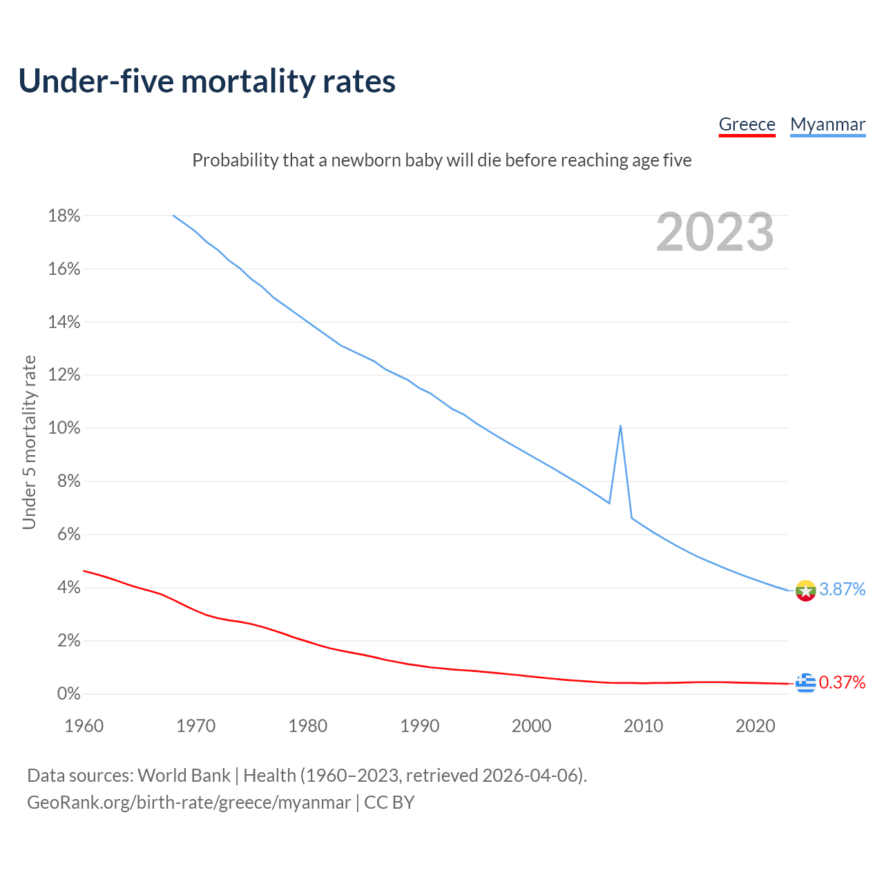 The chance that a newborn baby will die before reaching age five is 0.37% in Greece and 3.87% in Myanmar. Above is a chart with historical data on under-five mortality rates.