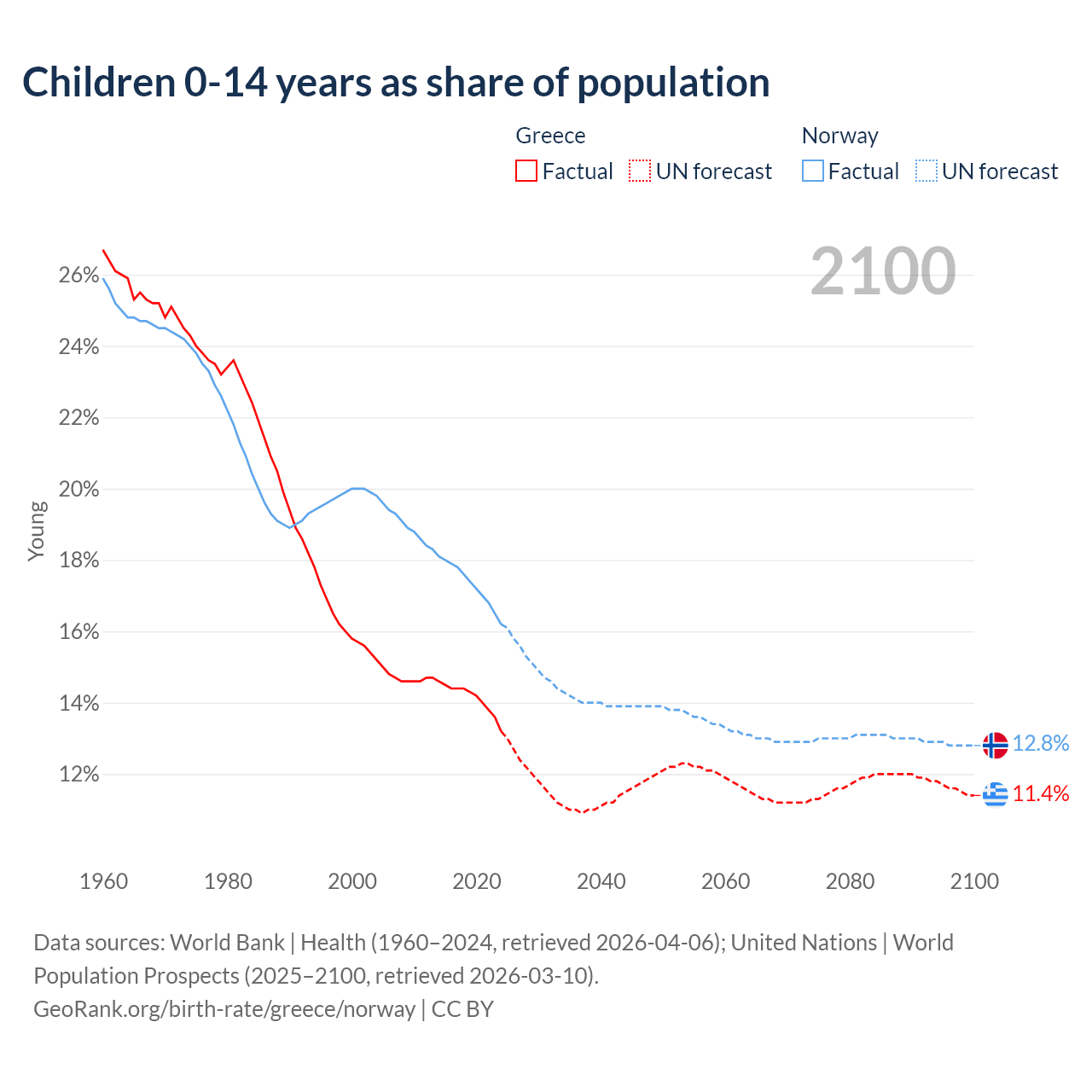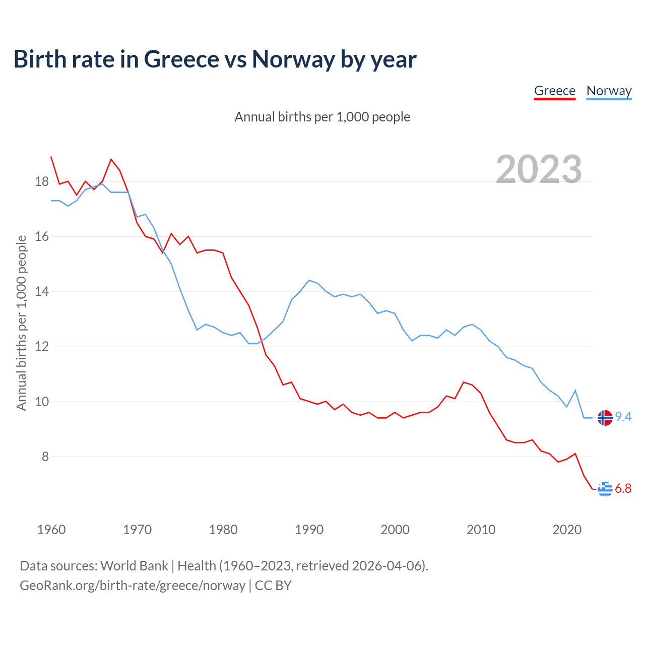Greece has an annual birth rate of 6.8 births per 1,000 people, compared to 9.4 for Norway. The average number of children a woman is expected to have during her lifetime — the fertility rate, is 1.32 in Greece and 1.4 in Norway — 6.06% difference.