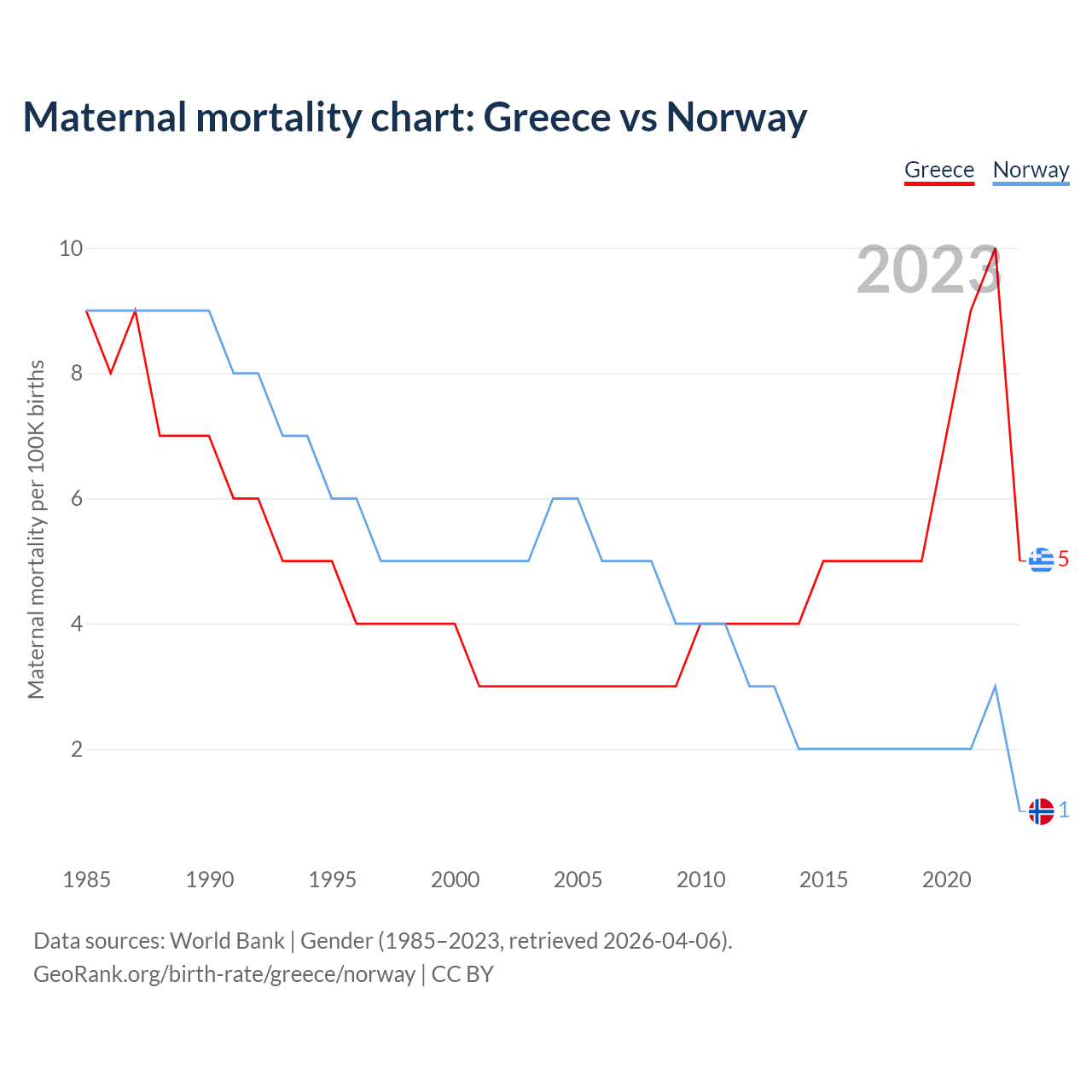 The maternal mortality rate, which is the probability of dying during childbirth or within 42 days of pregnancy termination, is 5 deaths per 100,000 live births in Greece, compared to 1 deaths in Norway.