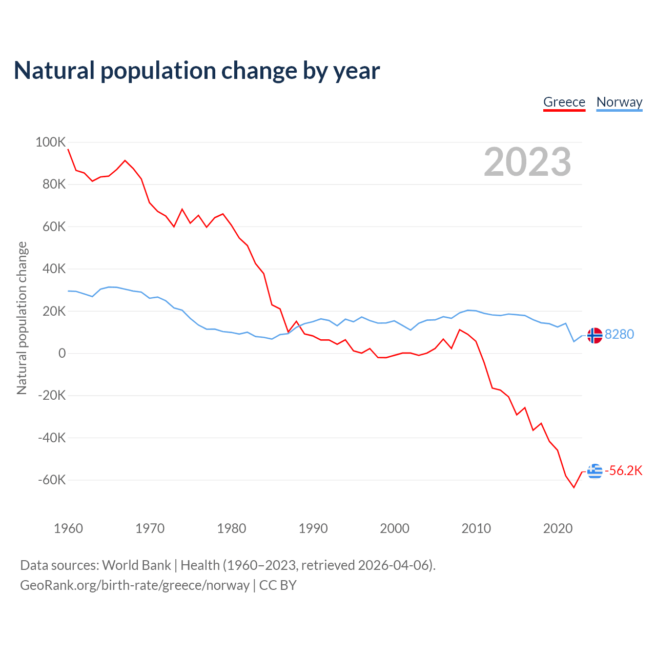 According to the latest available data on birth rates, the fertility rate in Greece was 1.32 children per woman in 2023, compared to 1.4 in Norway in 2023. The replacement level is considered to be 2.1 children per woman.