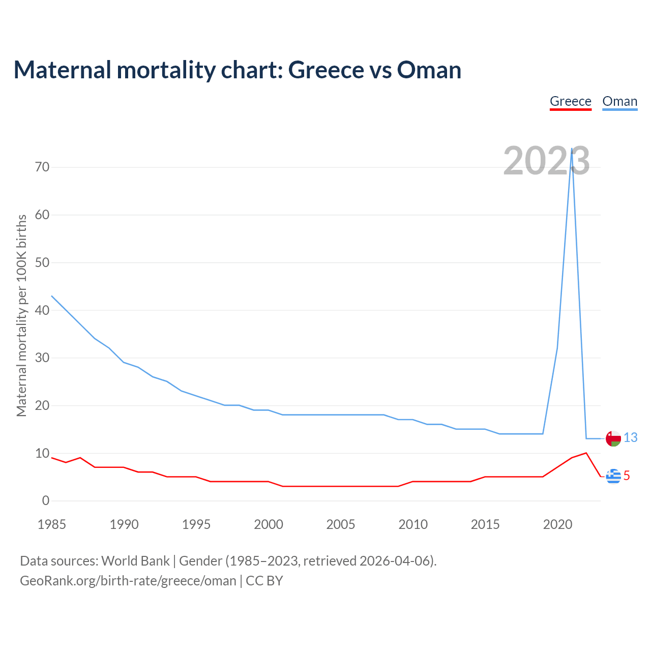 The maternal mortality rate, which is the probability of dying during childbirth or within 42 days of pregnancy termination, is 5 deaths per 100,000 live births in Greece, compared to 13 deaths in Oman.
