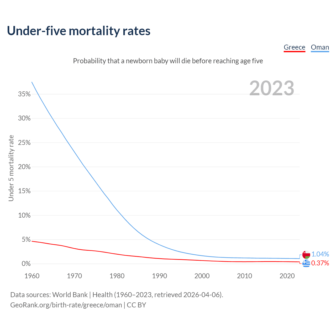 The chance that a newborn baby will die before reaching age five is 0.37% in Greece and 1.04% in Oman. Above is a chart with historical data on under-five mortality rates.