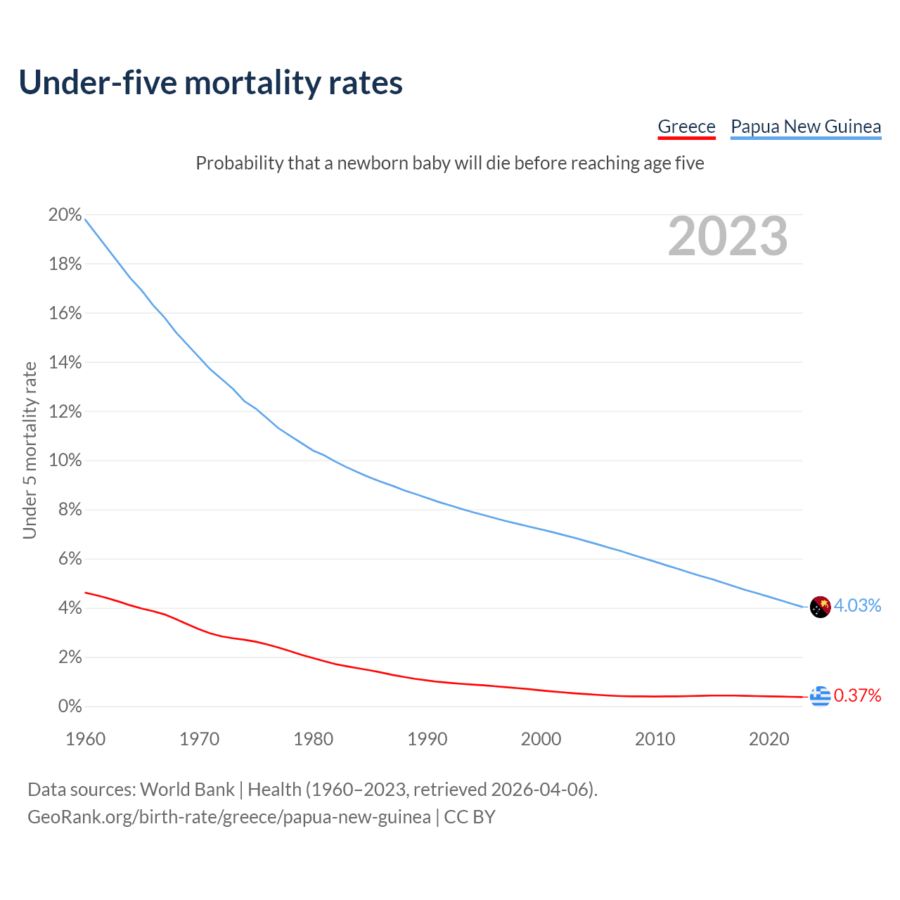 The chance that a newborn baby will die before reaching age five is 0.37% in Greece and 4.03% in Papua New Guinea. Above is a chart with historical data on under-five mortality rates.