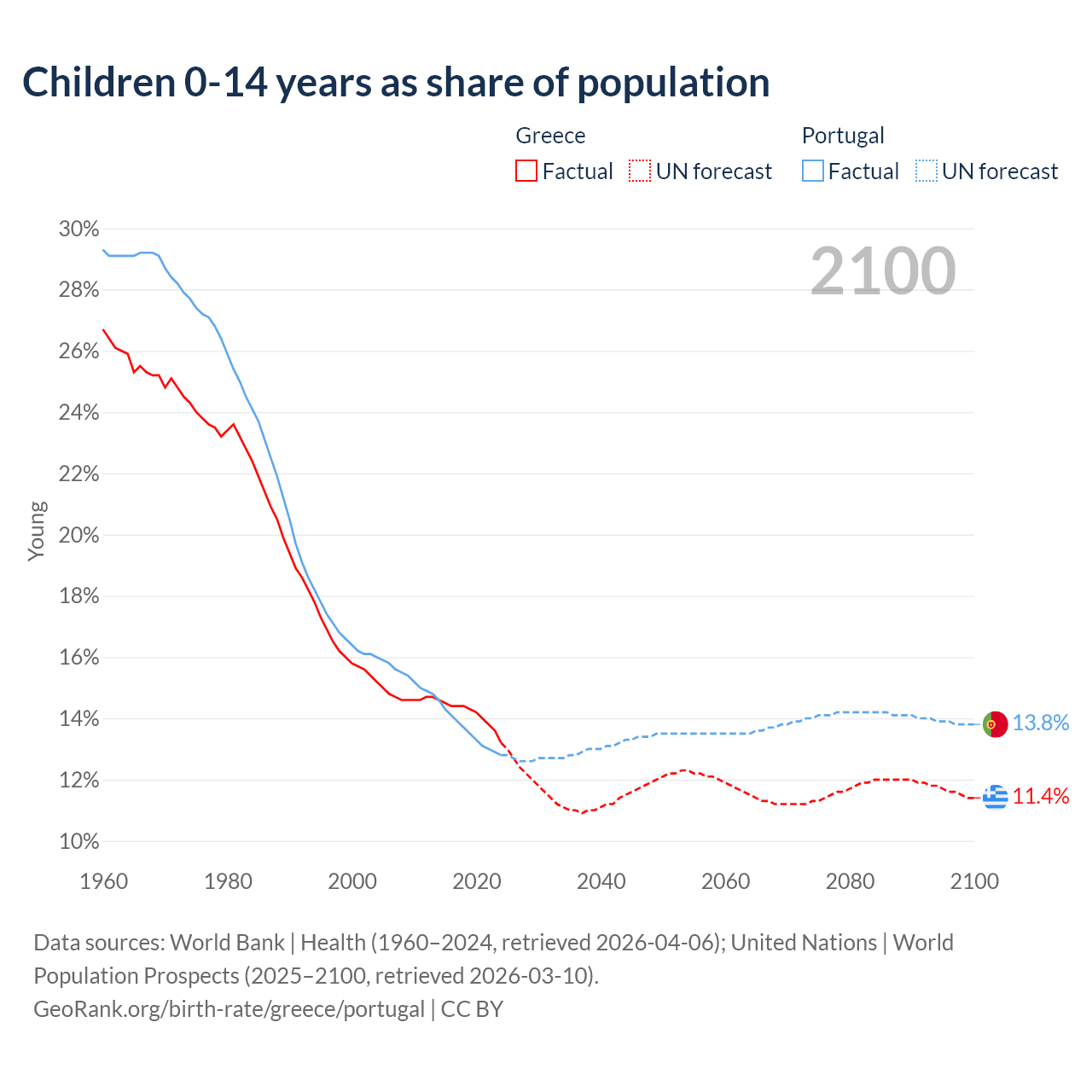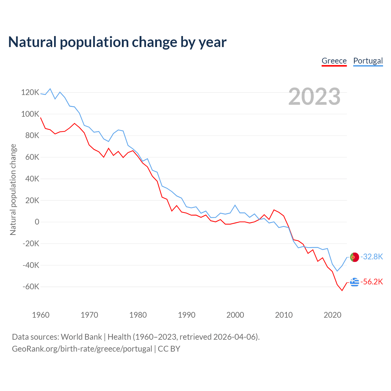 According to the latest available data on birth rates, the fertility rate in Greece was 1.32 children per woman in 2023, compared to 1.44 in Portugal in 2023. The replacement level is considered to be 2.1 children per woman.