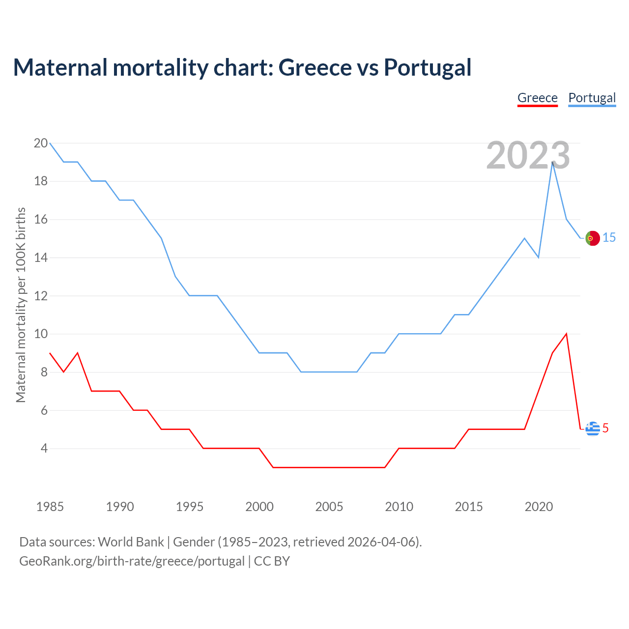 The maternal mortality rate, which is the probability of dying during childbirth or within 42 days of pregnancy termination, is 5 deaths per 100,000 live births in Greece, compared to 15 deaths in Portugal.