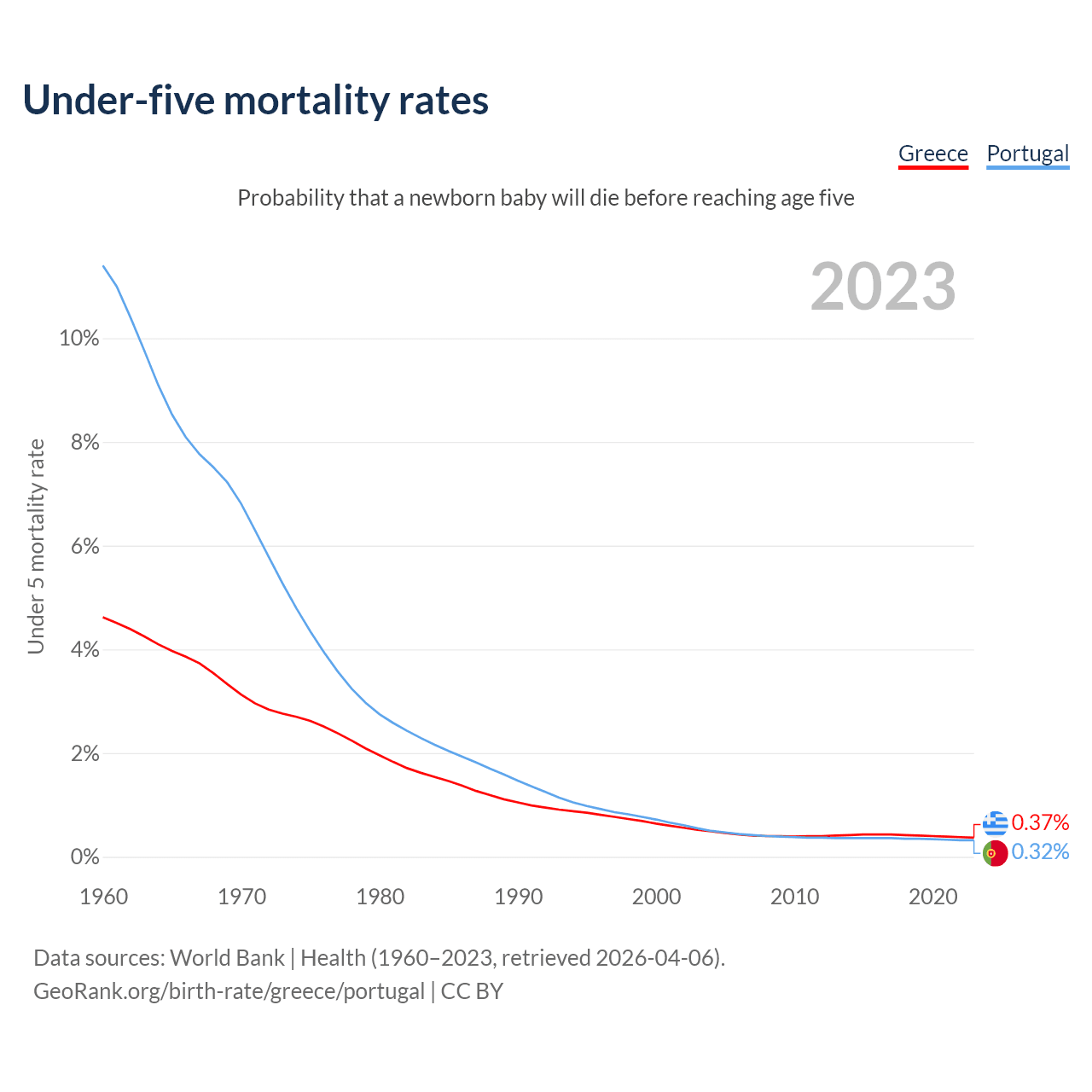 The chance that a newborn baby will die before reaching age five is 0.37% in Greece and 0.32% in Portugal. Above is a chart with historical data on under-five mortality rates.