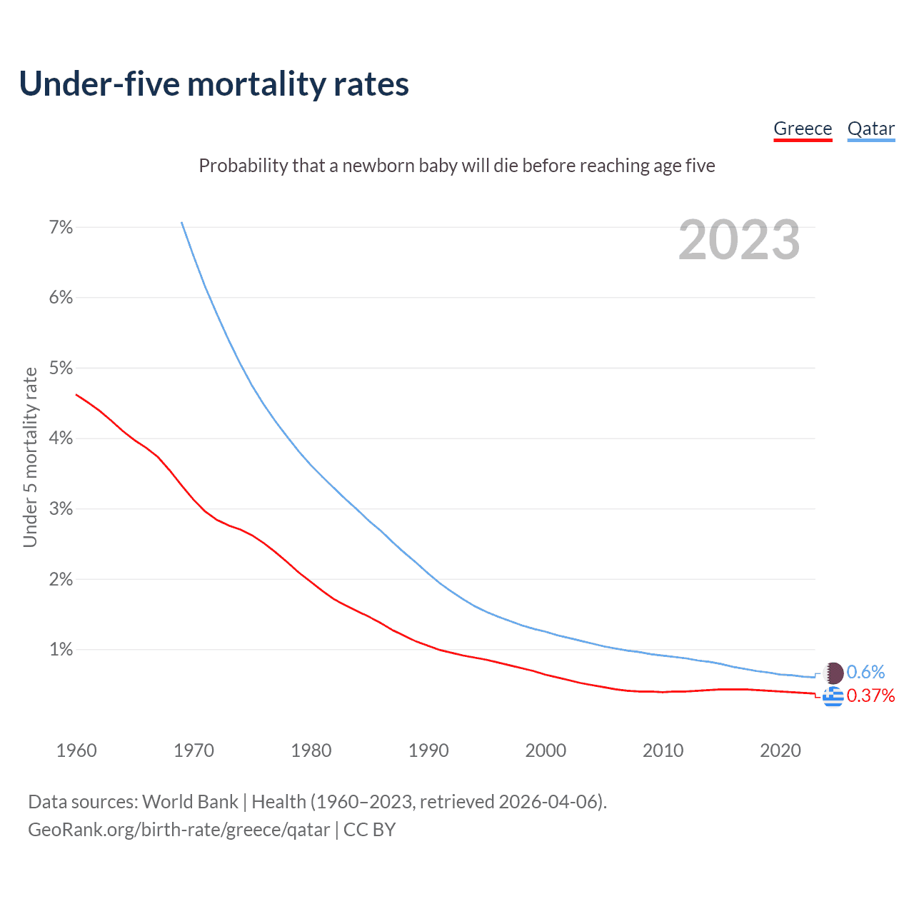 The chance that a newborn baby will die before reaching age five is 0.37% in Greece and 0.6% in Qatar. Above is a chart with historical data on under-five mortality rates.